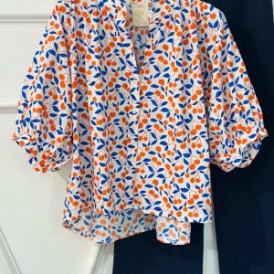 Blouse April Vintage liberty cerises bleu et rouge manches mi longues