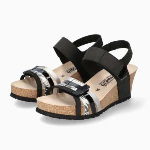 Sandale cuir femme semelle liège compensée fermeture 2 velcros MEPHISTO LUCIA coloris noirargent ou blancargent
