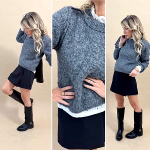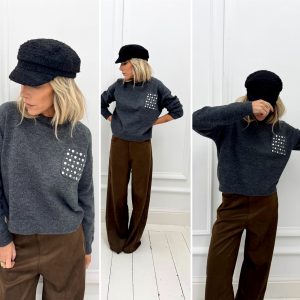 Pull gris avec poche cloutée argentée