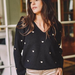 Pull col V coeur noir et or