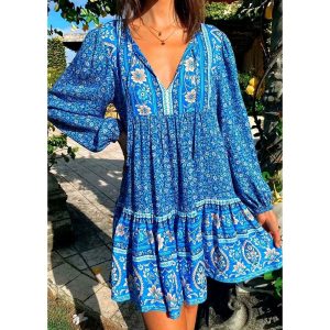 Robe Hippie Indienne Fleur Bleu
