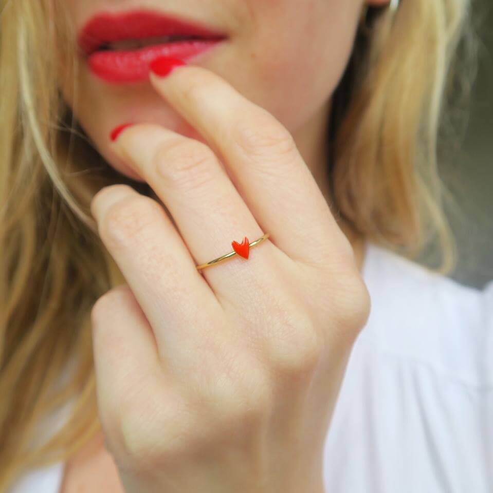 Cette adorable bague ajustable dorée à l’or fin (1 micron) ornée d’un petit coeur émaillé rose tout doux ou rouge coquelicot ne vous quittera plus dès lors que vous l’aurez essayée. Discrète avec une pointe de couleur et de mignonnerie, elle habillera parfaitement votre main pour les beaux jours.