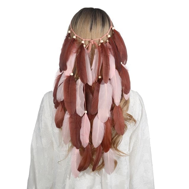 Adoptez le Bandeau à Plumes aux Nuances Marron et Rose pour un Style Boho-Chic incontournable