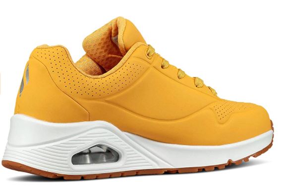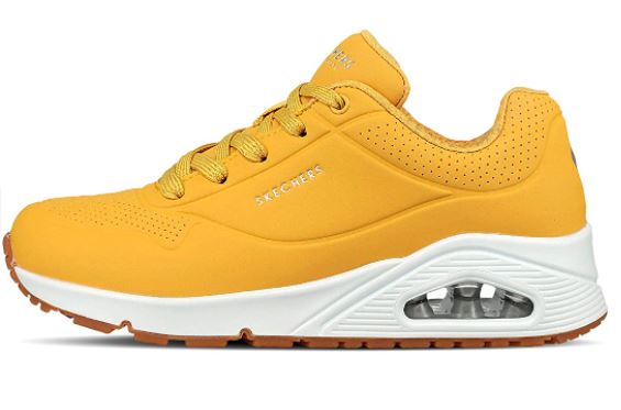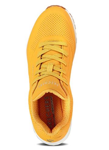 Le style classique à coussin d’air et le confort actualisé de la chaussure SKECHERS Uno. Tige synthétique texturée dans une basket mode à lacets avec des coutures et des accents de perforation. Semelle intérieure en mousse à mémoire de forme refroidie par air, semelle intercalaire à coussin d’air visible. Ces tennis sont monté sur une semelle blanche qui souligne le coloris jaune de la tige, l’ensemble créant un bel effet volume. Des baskets adaptées pour de longues balades, pour des séances de sport ou tout simplement pour donner à vos tenues un look dynamique et sportif. Fermeture lacets 5 œillets.