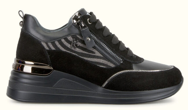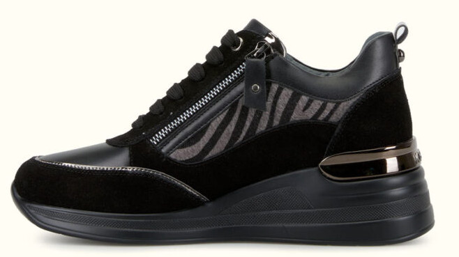Basket en cuir. Talon compensée. Motif zèbre. Fermeture par lacet et zips sur les côtés.