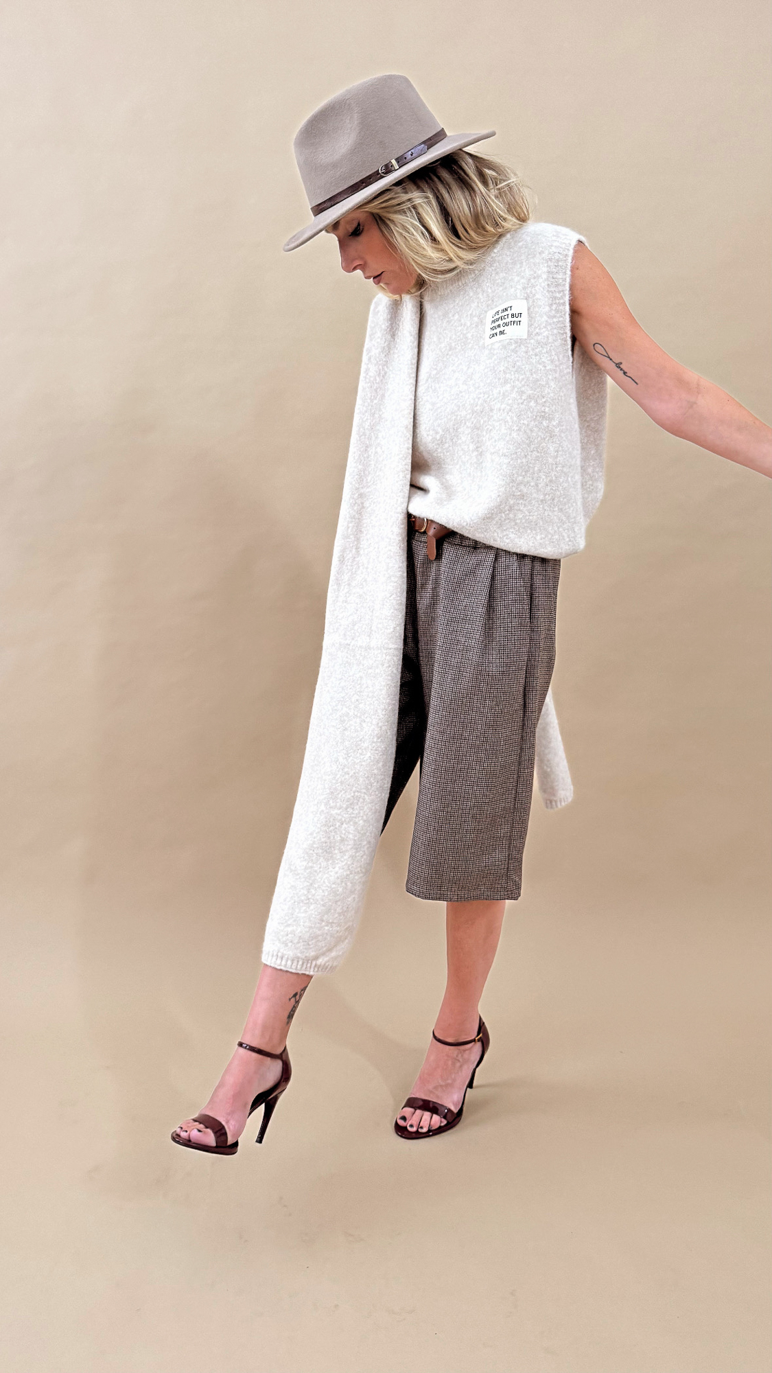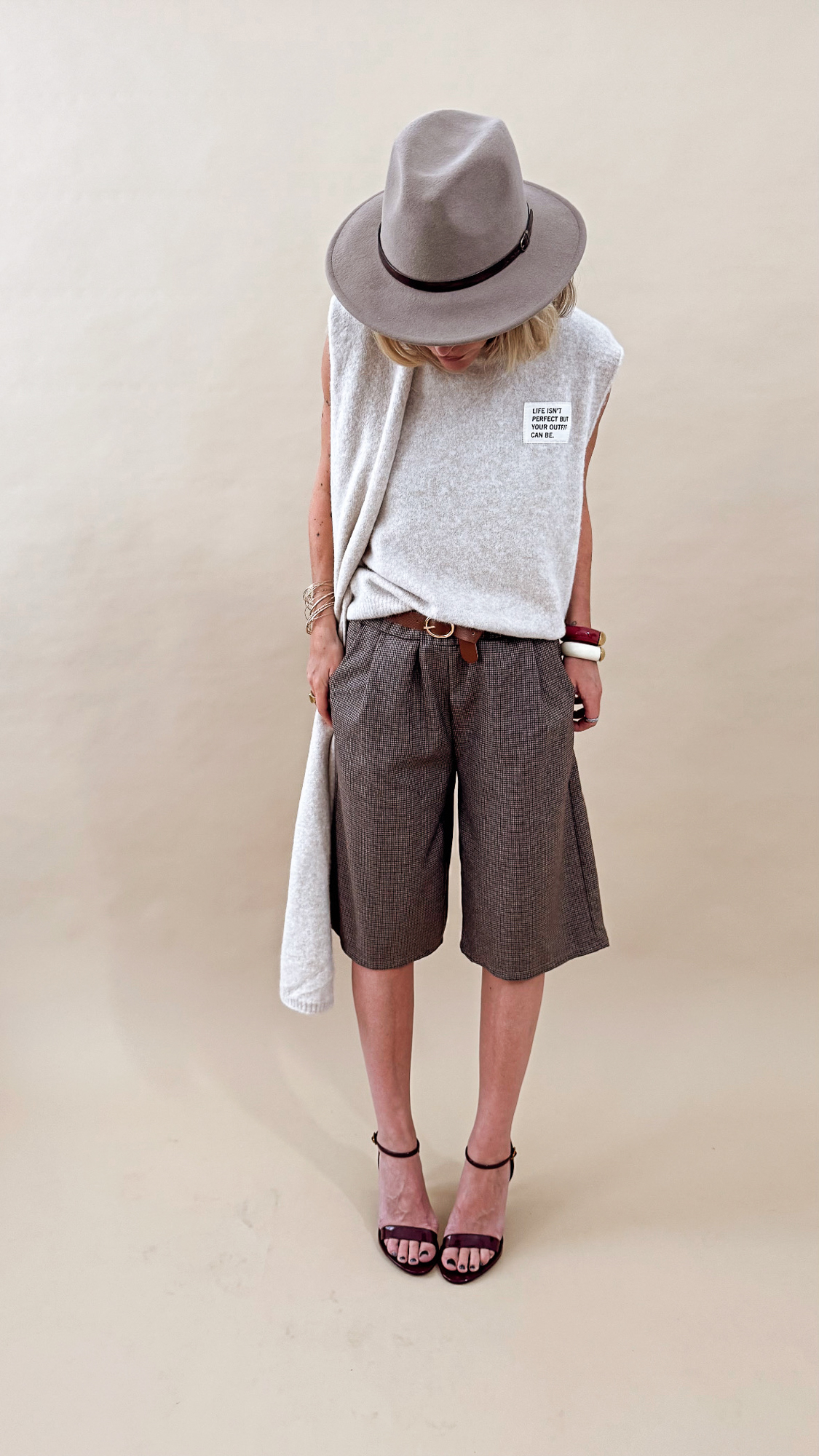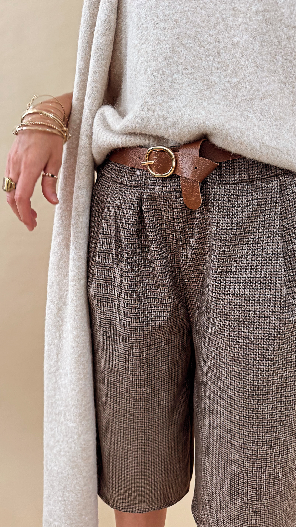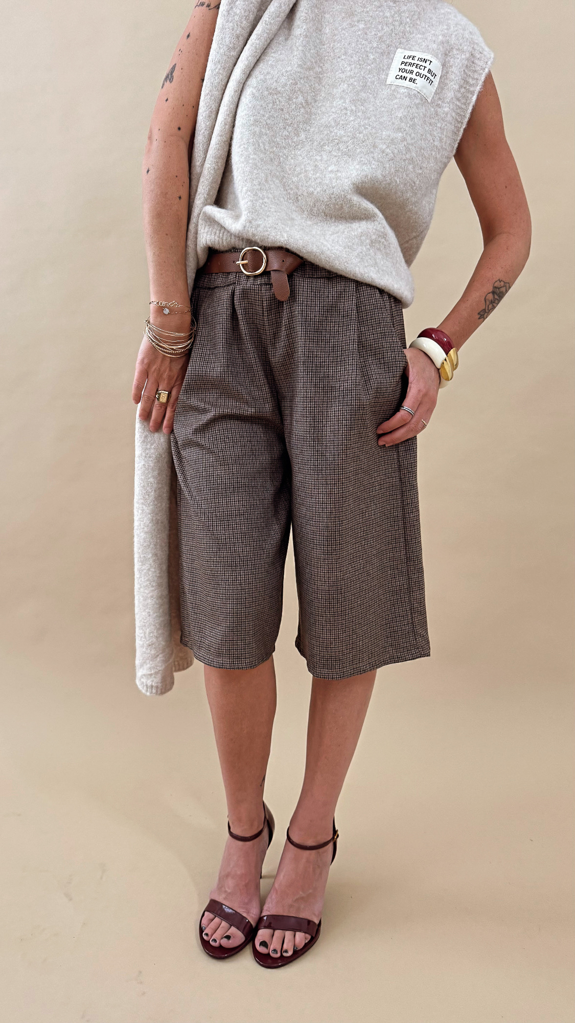 Le bermuda marron pied de poule ceinturé pour un look élégant et tendance !