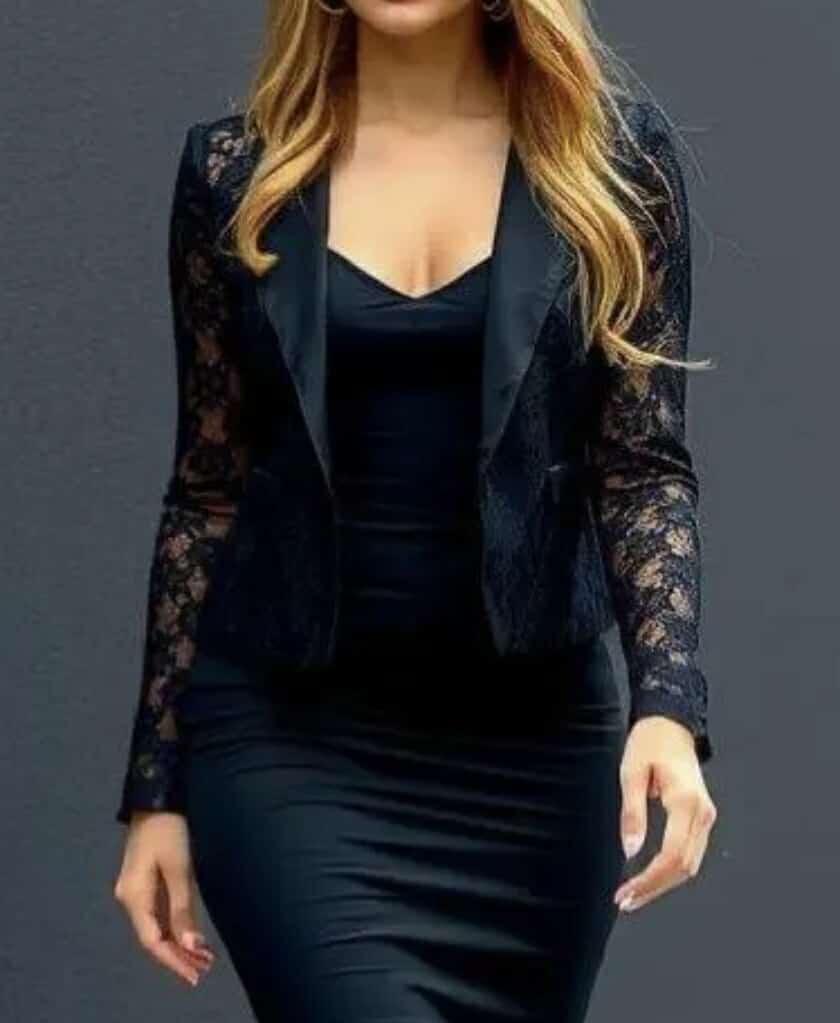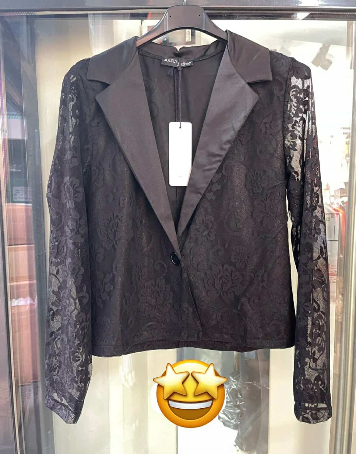 Magnifique blazer tout en dentelle avec revers satiné. Manches dentelles transparentes. L’avant et le dos sont en dentelle mais entièrement doublé.