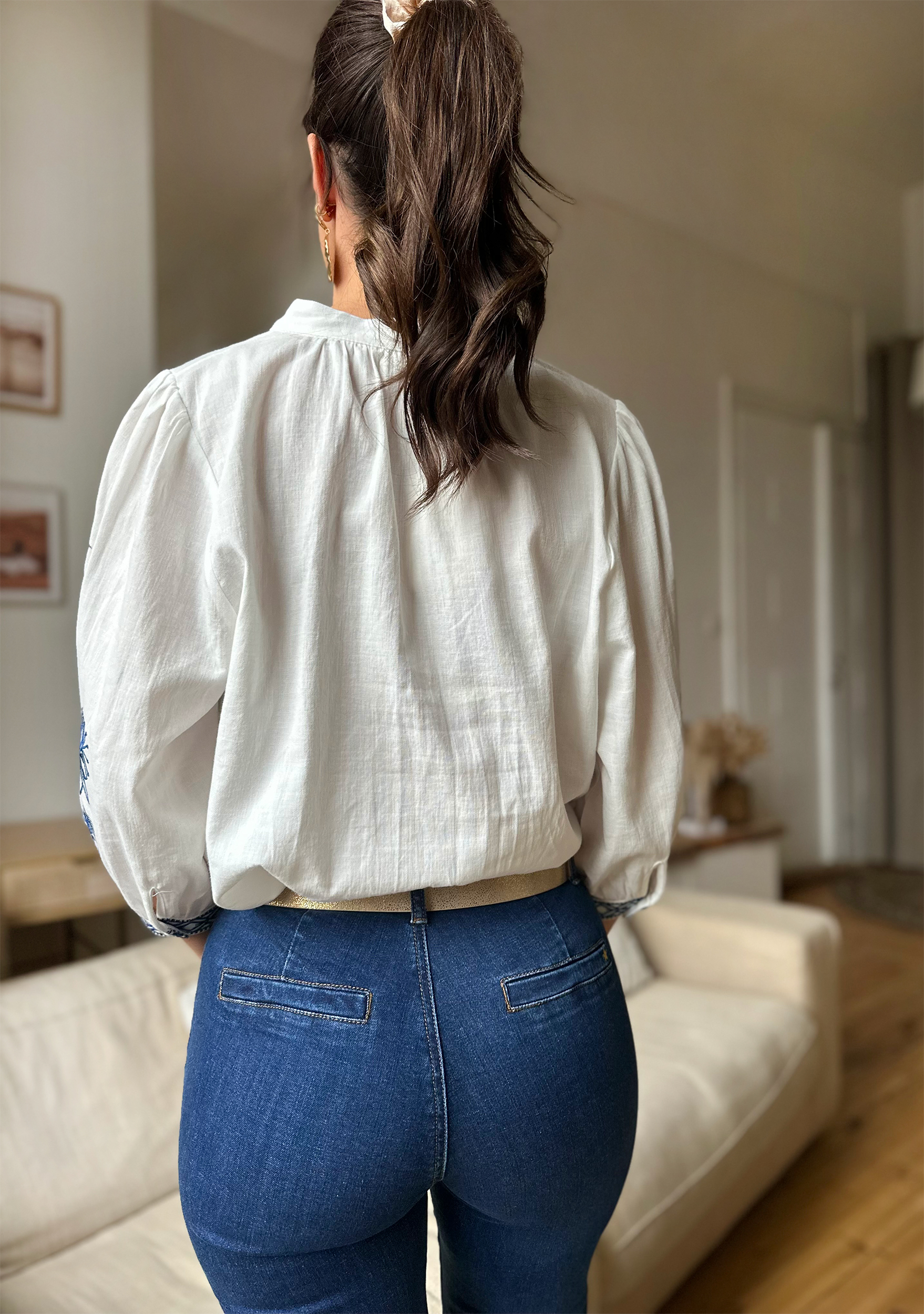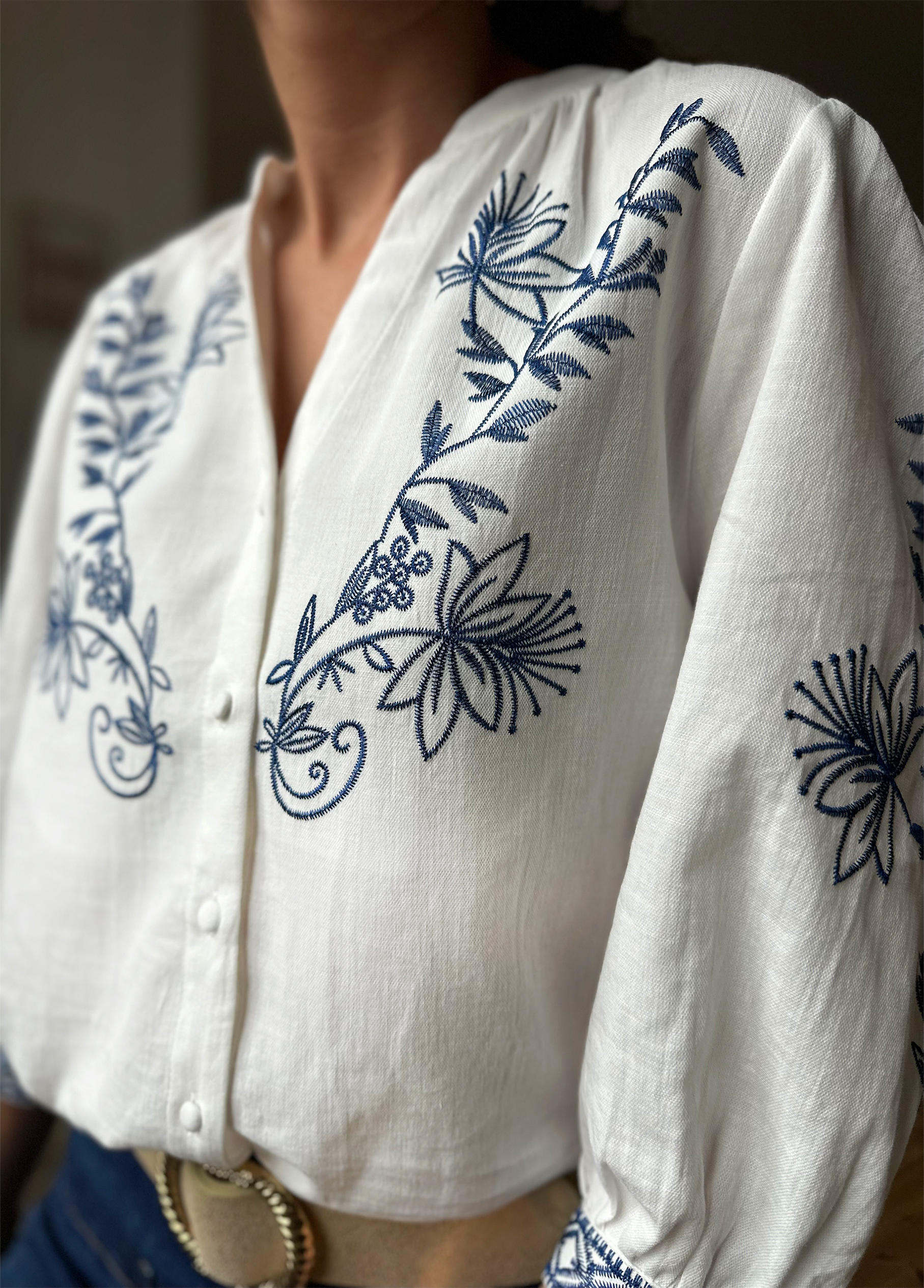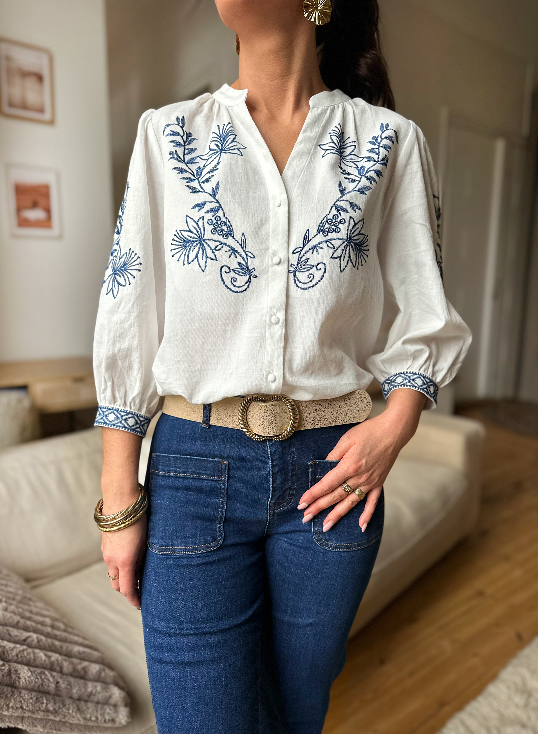 La blouse ANNA représente l’élégance et la féminité grâce à ses somptueux détails en broderie bleue. Ses détails apporteront une touche de romantisme à vos looks. Idéale à porter avec un jean ou un pantalon taille haute.