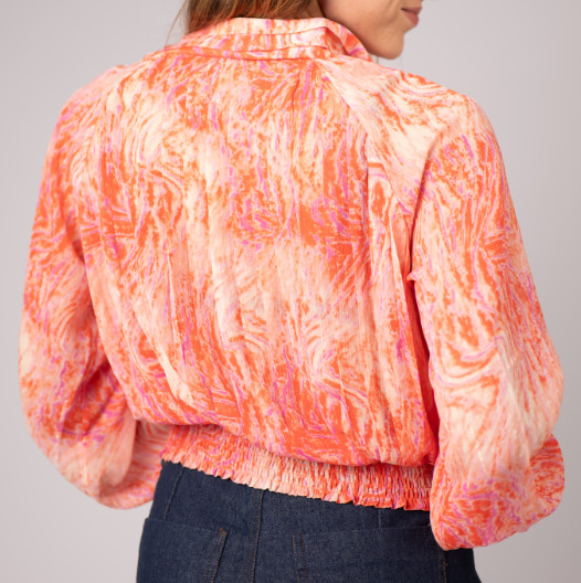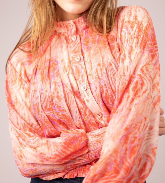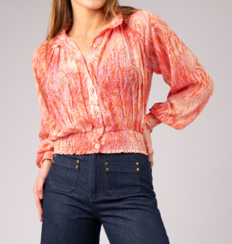 Blouse transparente à manches longues bouffantes, col haut. Entièrement boutonnée. Détails plissés à l’avant et à l’arrière. Smoke au niveau des poignets et de la taille. Petits fils brillants dans l’imprimé.