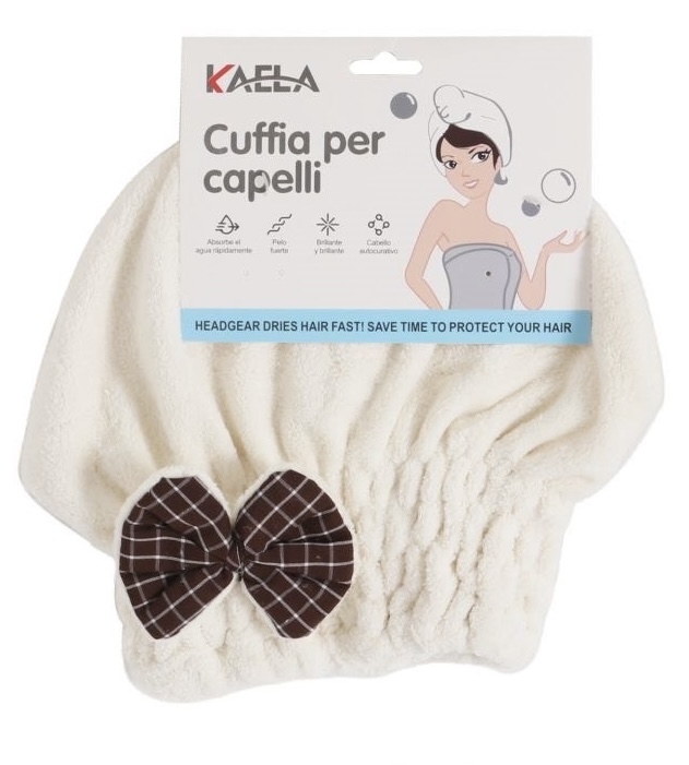 Mode d’emploi : Enroulez délicatement vos cheveux mouillés dans le bonnet, nouez l’attache et laissez agir 10-15 minutes pour un séchage optimal.