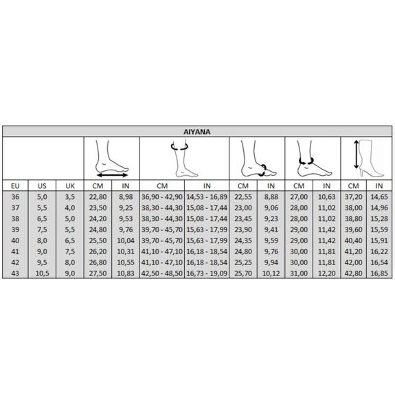 - Les bottes Aiyana sont dotées d’un talon plat. garantissant un confort optimal pour une utilisation quotidienne. La grande innovation de ce modèle est son système Vario. qui permet d’ajuster la taille des bottes. passant facilement de XL à 2XL. Grâce à cet ajustement flexible.