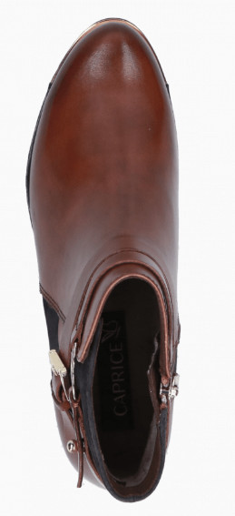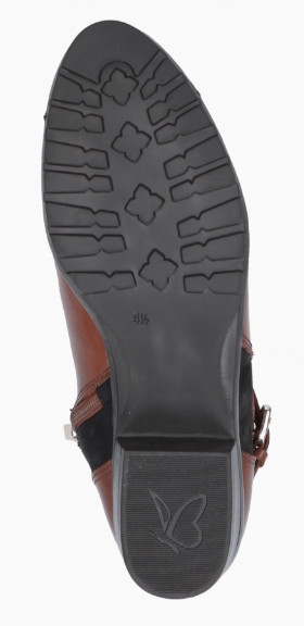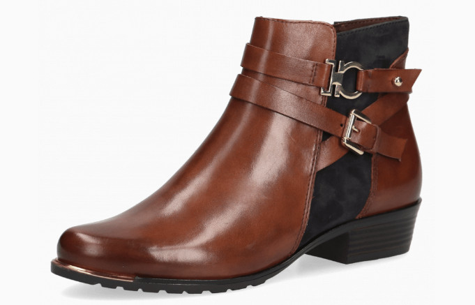 Bottine en cuir bi-matière, partie cuir coloris cognac et partie nubuck coloris marine. Semelle intérieure amovible. Petit talon de 3 cm.