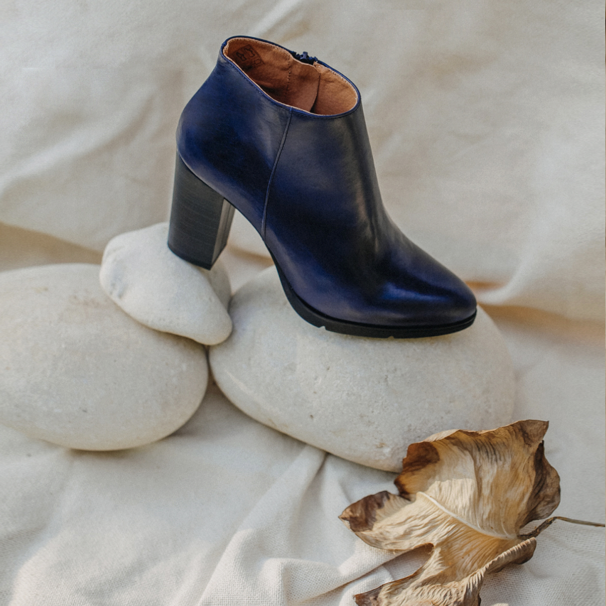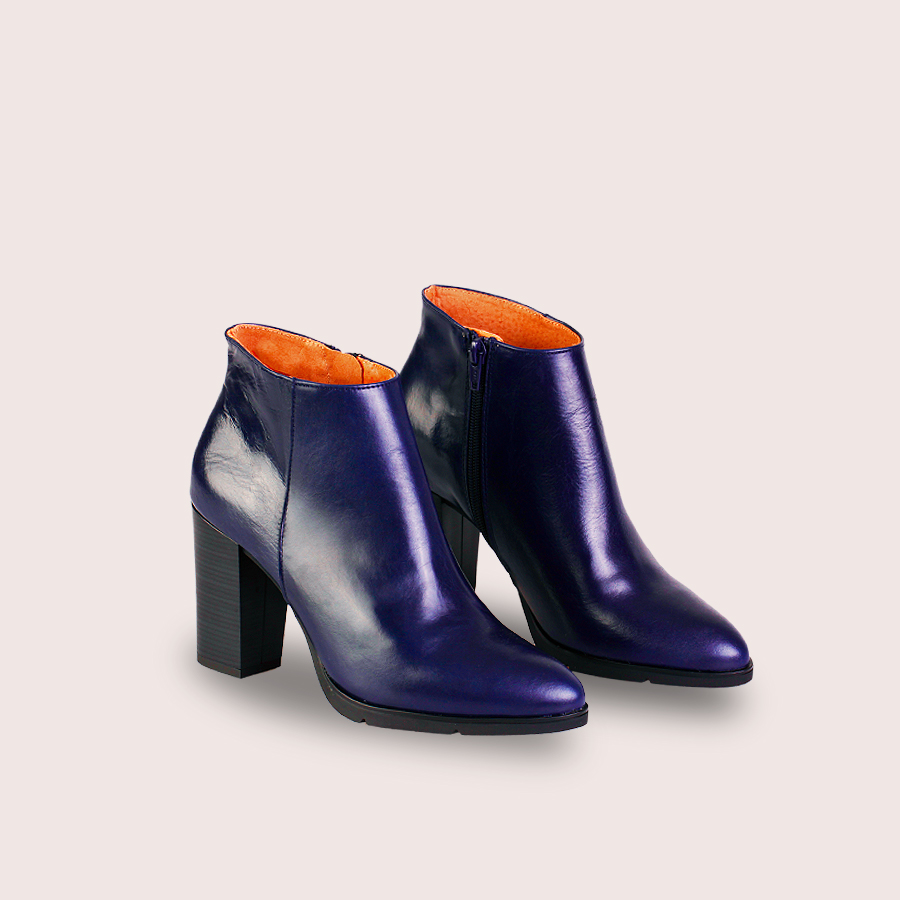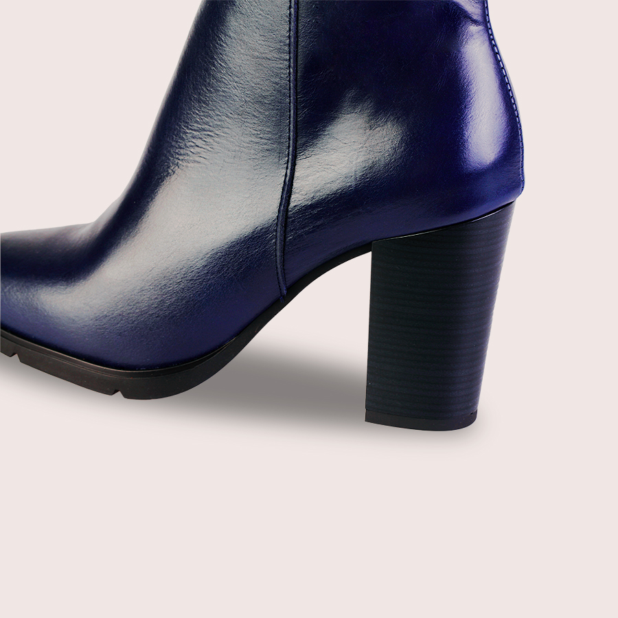 Bottines à talons hauts en cuir marine très doux. Fabriqué à la main en Espagne.