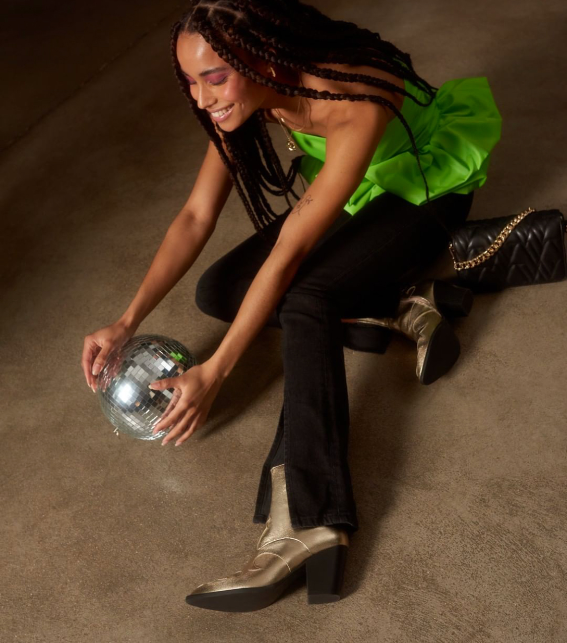 Découvez CLAUDIA, nos bottines style santiags en similicuir or champagne texturé