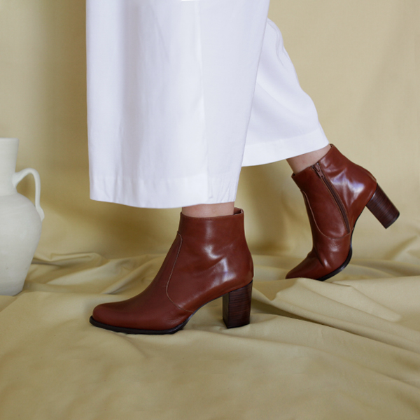 Bottines à talons hauts en cuir cognac très doux. Fabriqué à la main en Espagne.