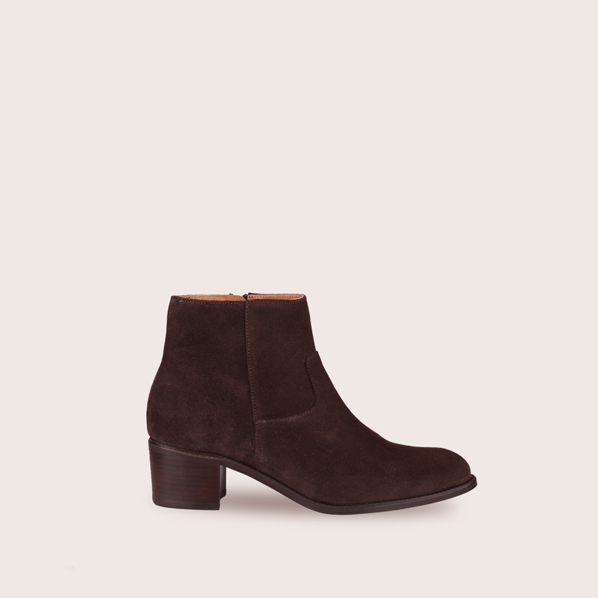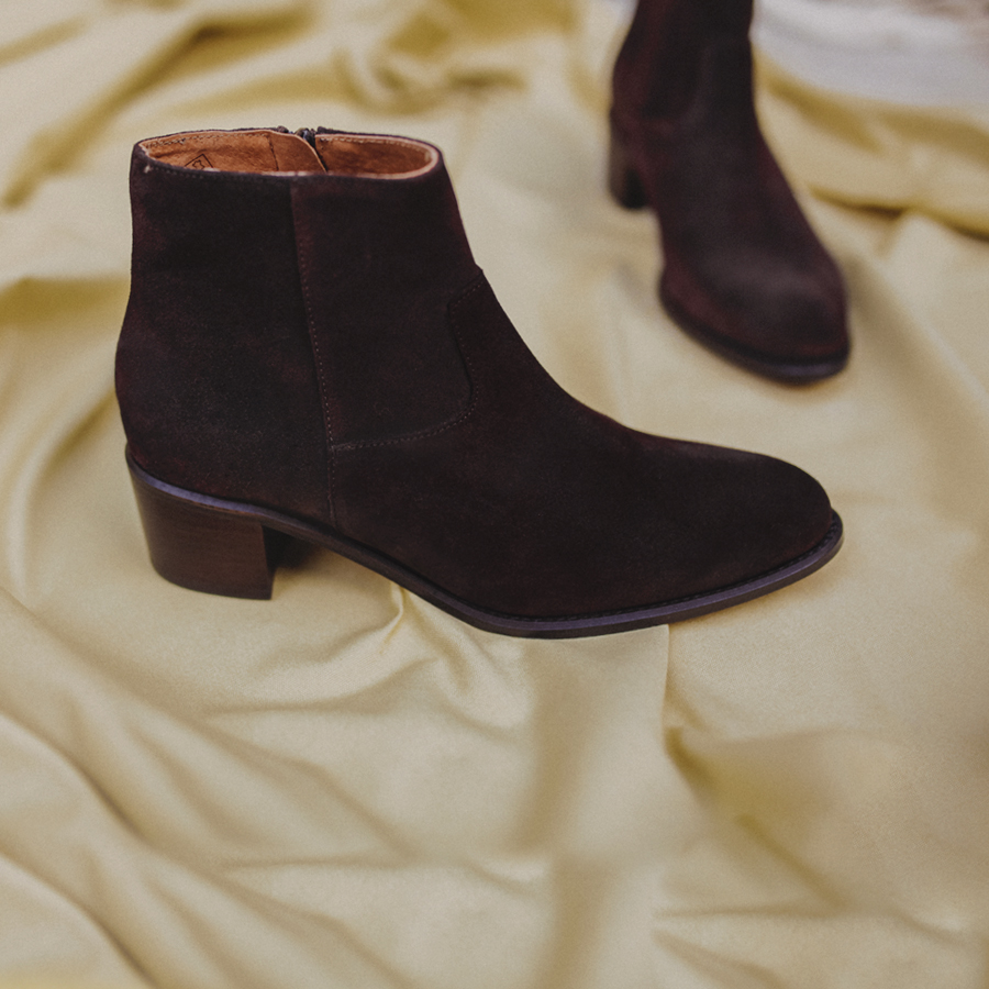 - Bottine en suédé marron à talon de 5 cm.
