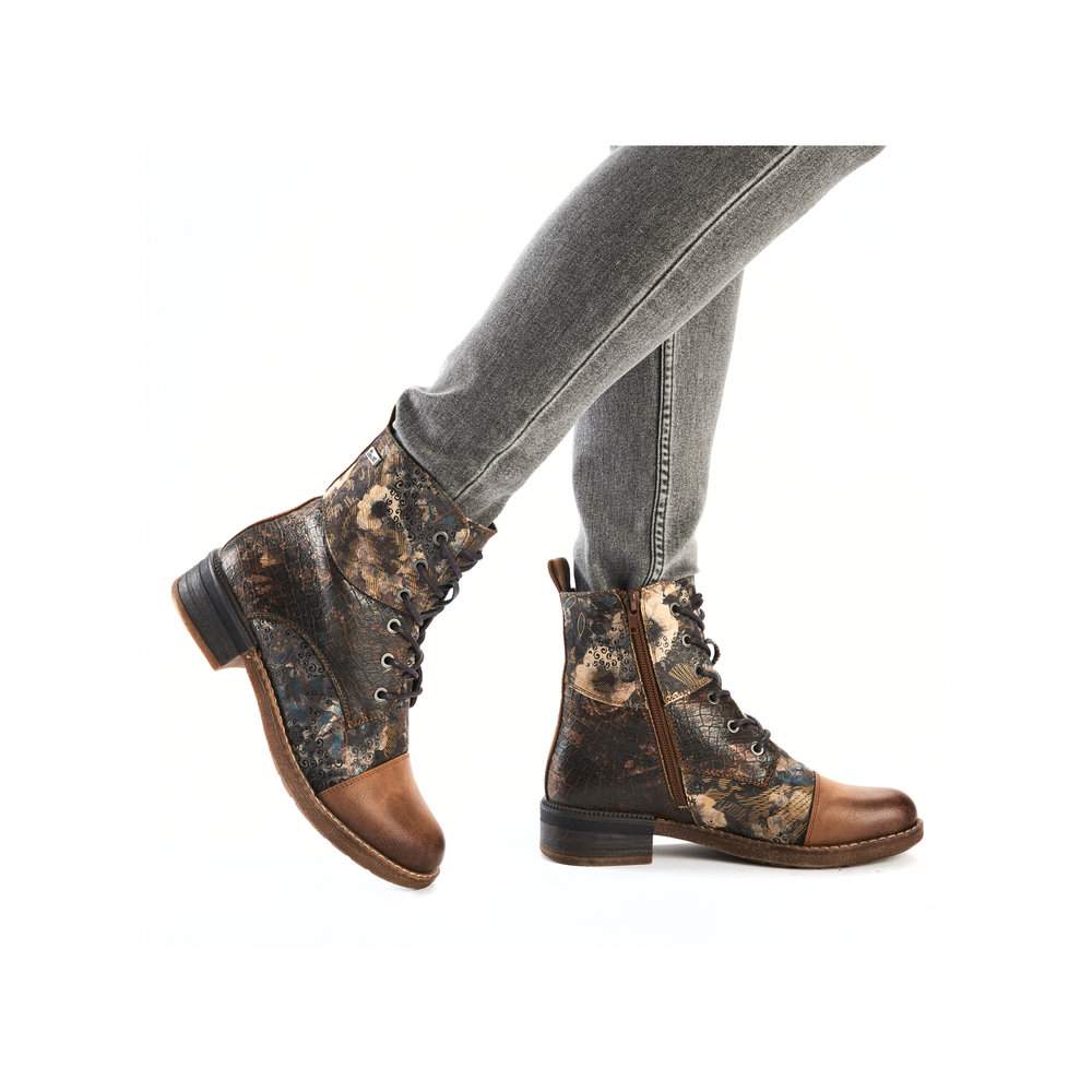 Bottines femme lacet+zip Doublure chaude Talon carré RIEKER coloris tan / multicolore