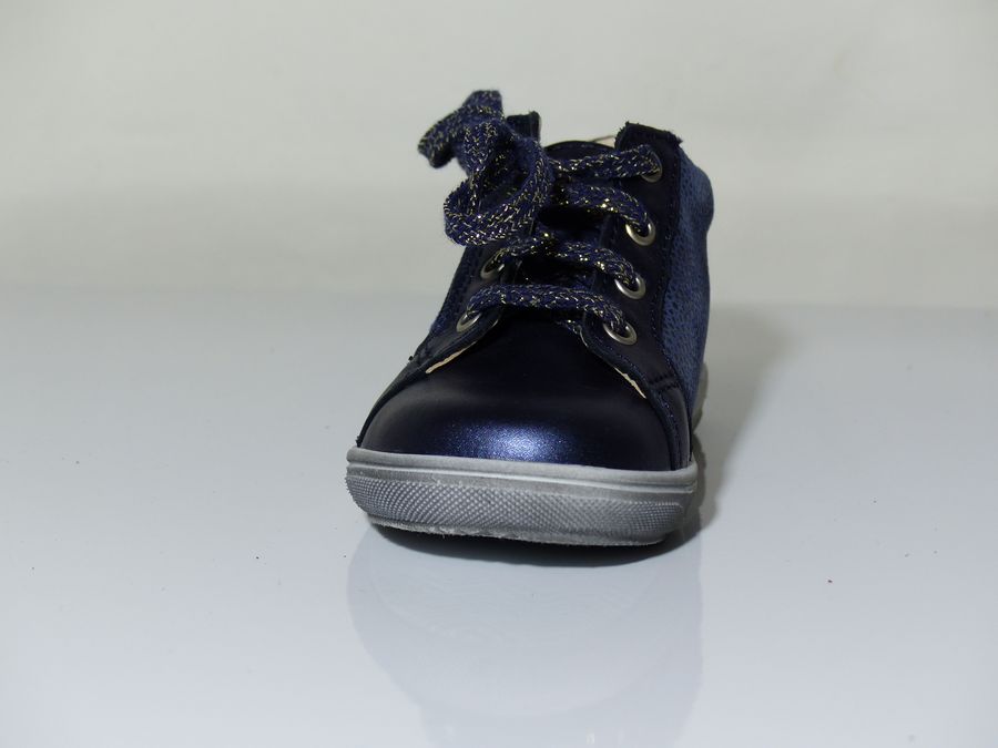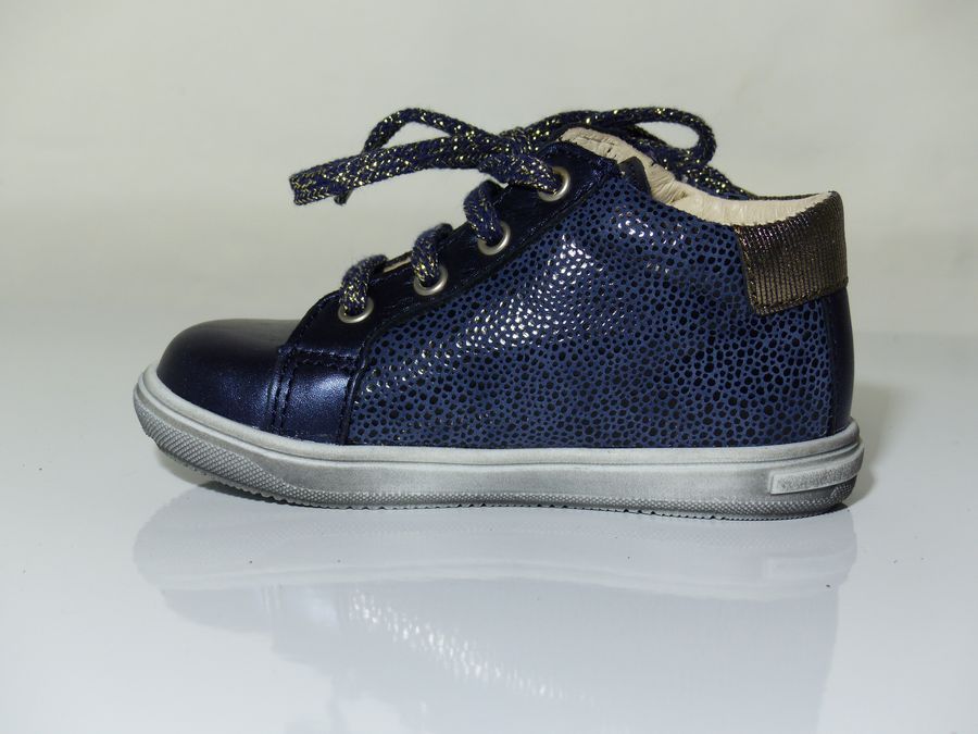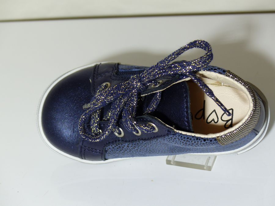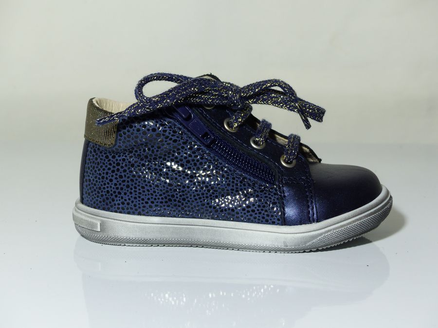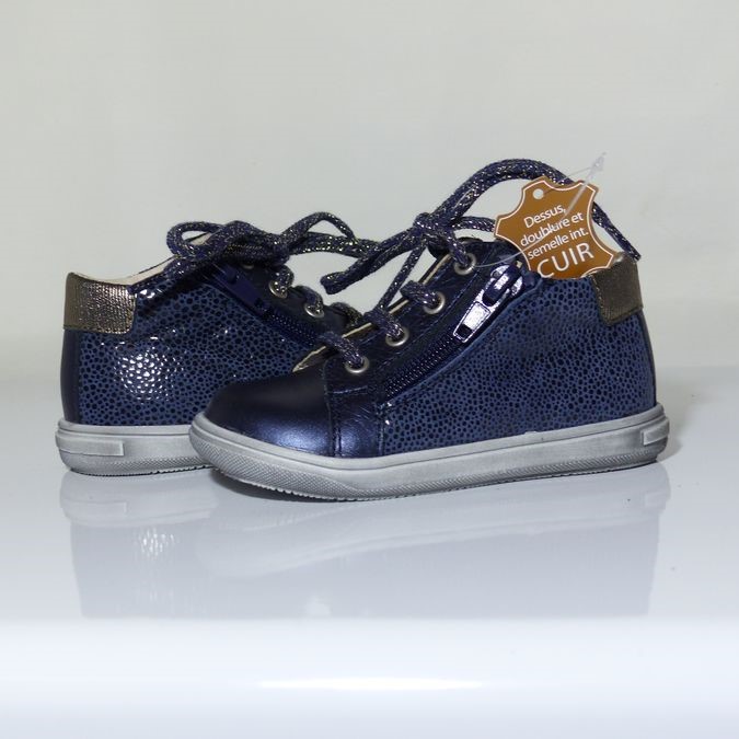 Bottines fillette de la marque BOPY. Le dessus est en cuir coloris bleu doublé cuir. La semelle intérieure en cuir également pour garder les pieds dans un environnement sain. Le chaussant est facilité grâce à un zip côté après réglage de la largeur à l’aide du lacet. L’arrière est assoupli pour ne pas blesser le tendon d’Achille.