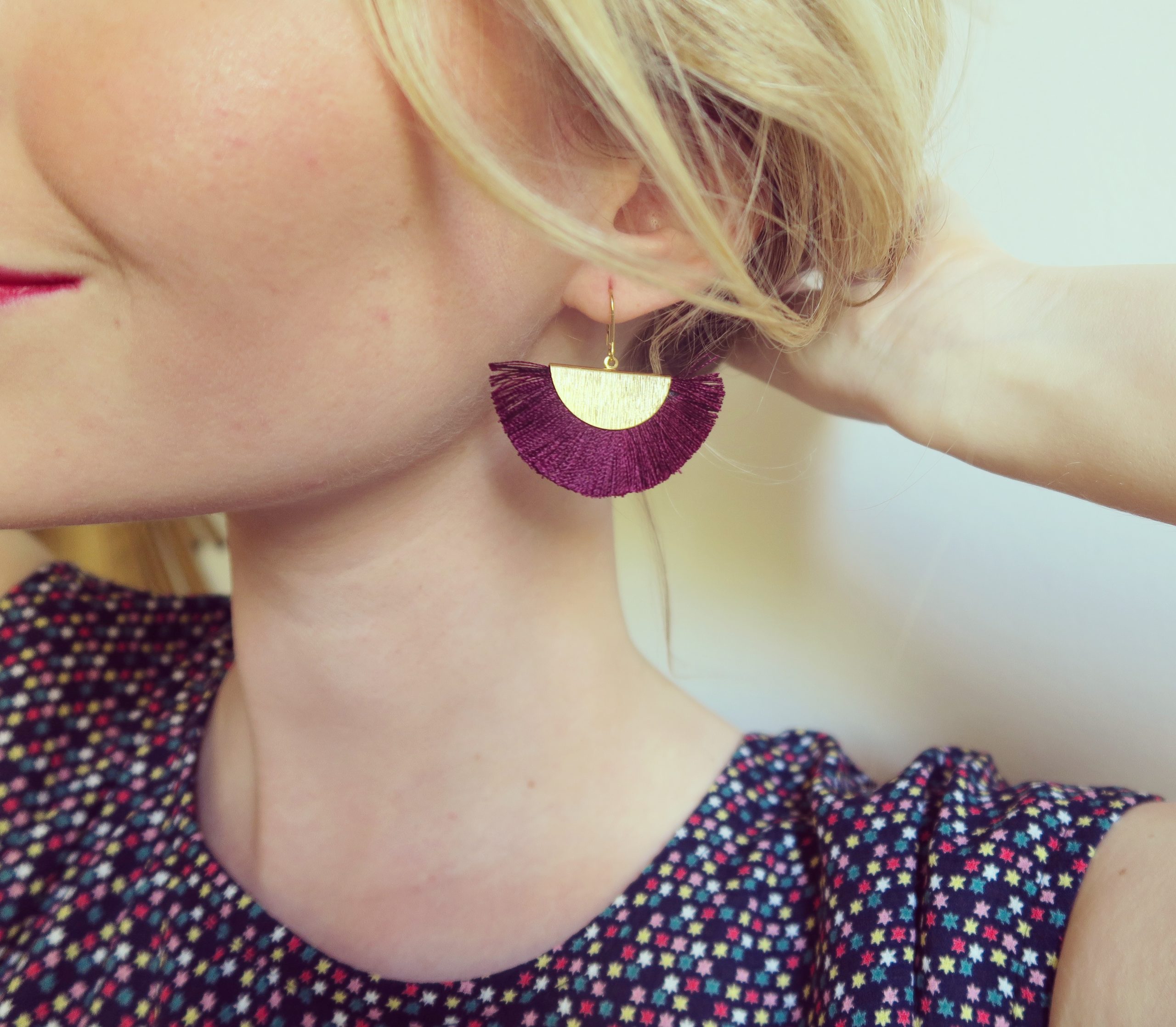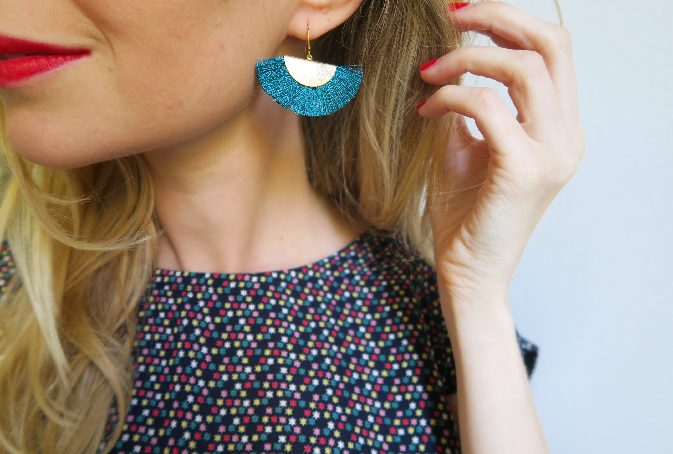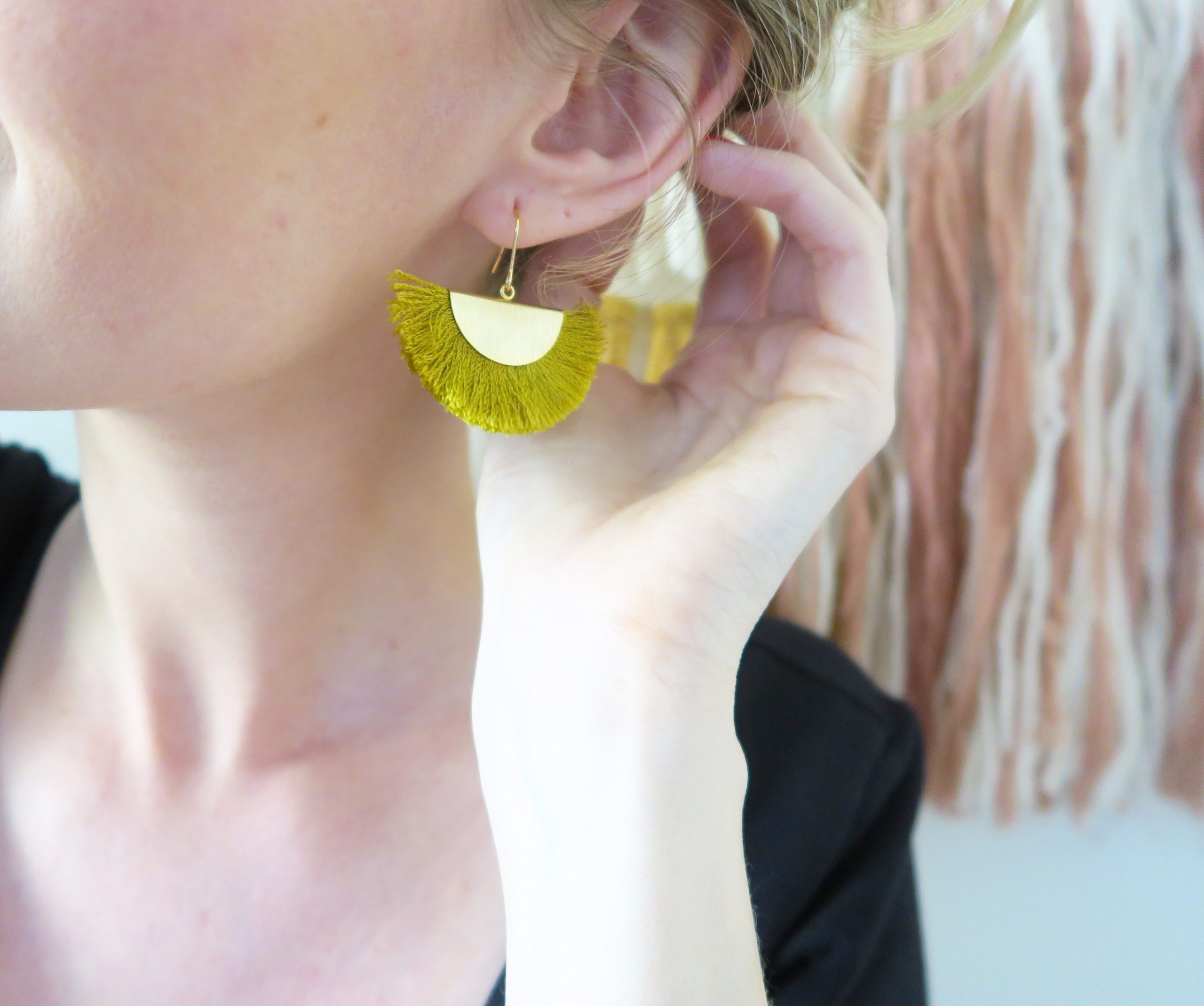 Cette adorable paire de boucles d’oreilles dorée ornée de frangettes délicatement travaillées (au choix moutarde, prune ou bleu canard) illuminera vos tenues automnales et hivernales en donnant une touche de pep’s à votre chevelure, sweats et gilets bien chauds ! Vous pourrez également la porter en parure avec le sautoir Mia de la même collection…