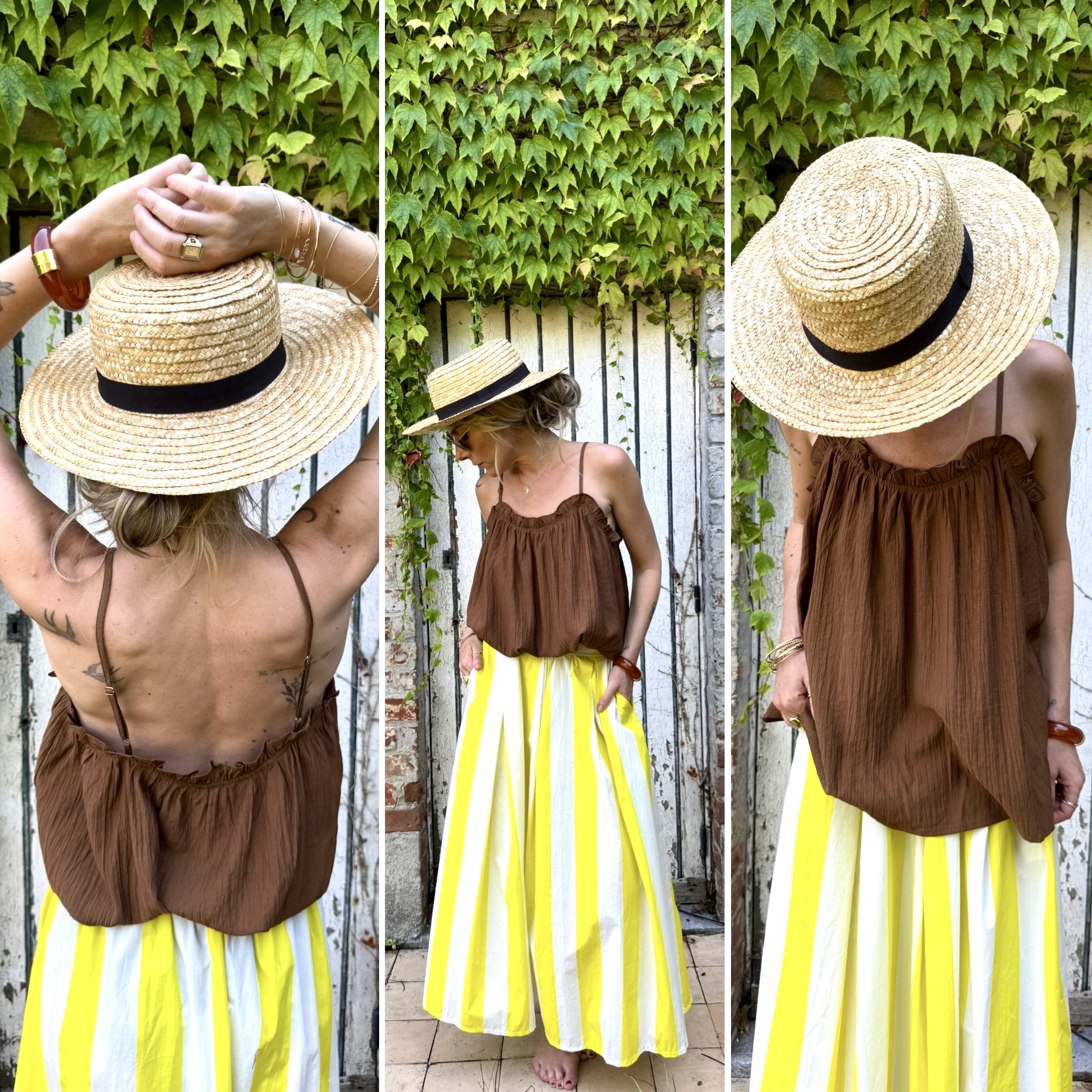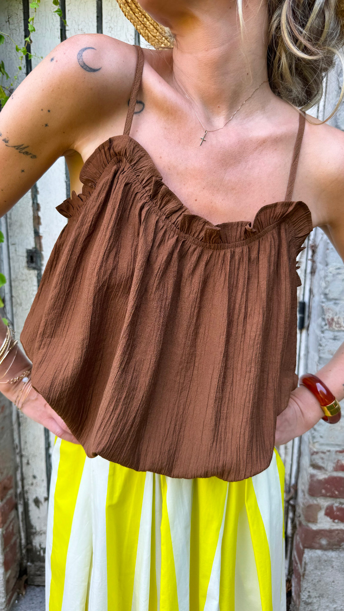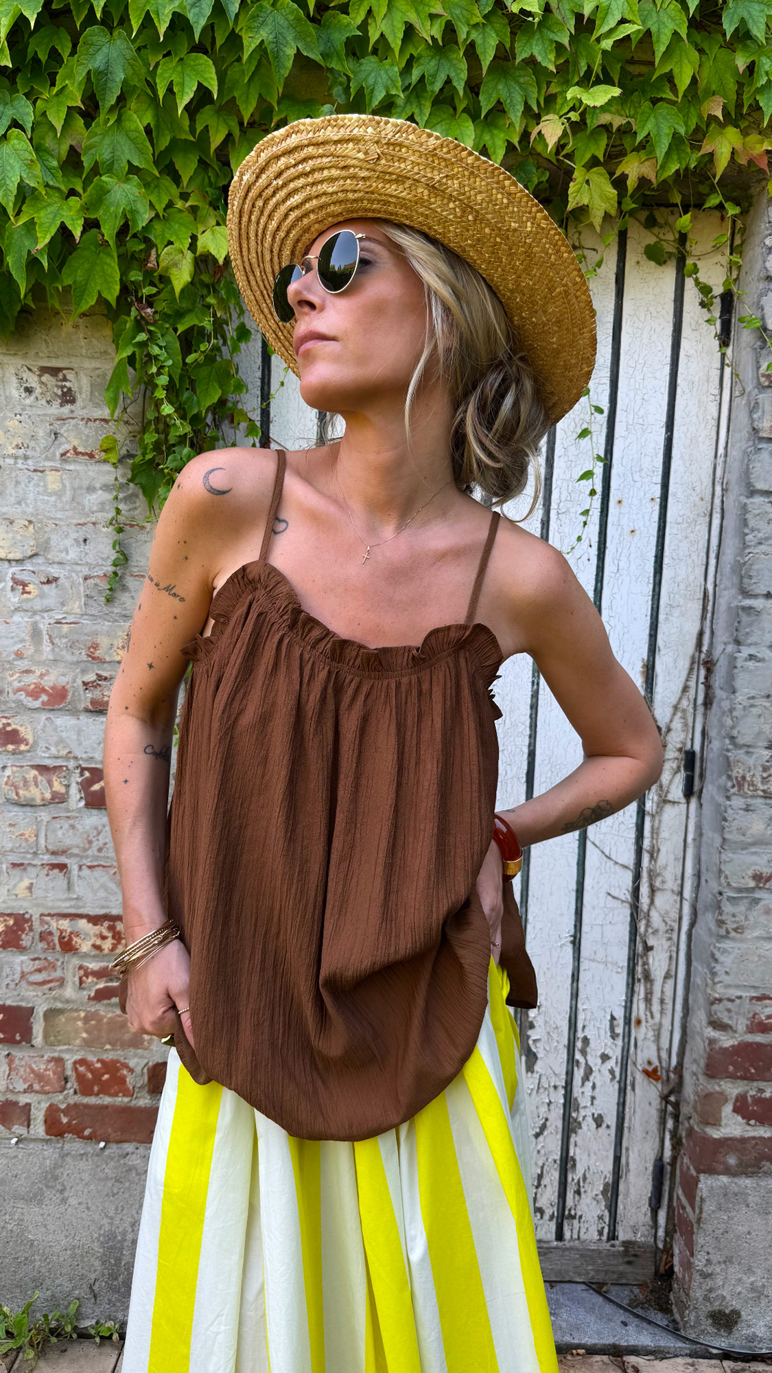 Confectionné dans un tissu doux et fluide, le caraco chocolat se distingue par ses volants délicats qui apportent du mouvement et une touche romantique à la silhouette. Bretelles réglables