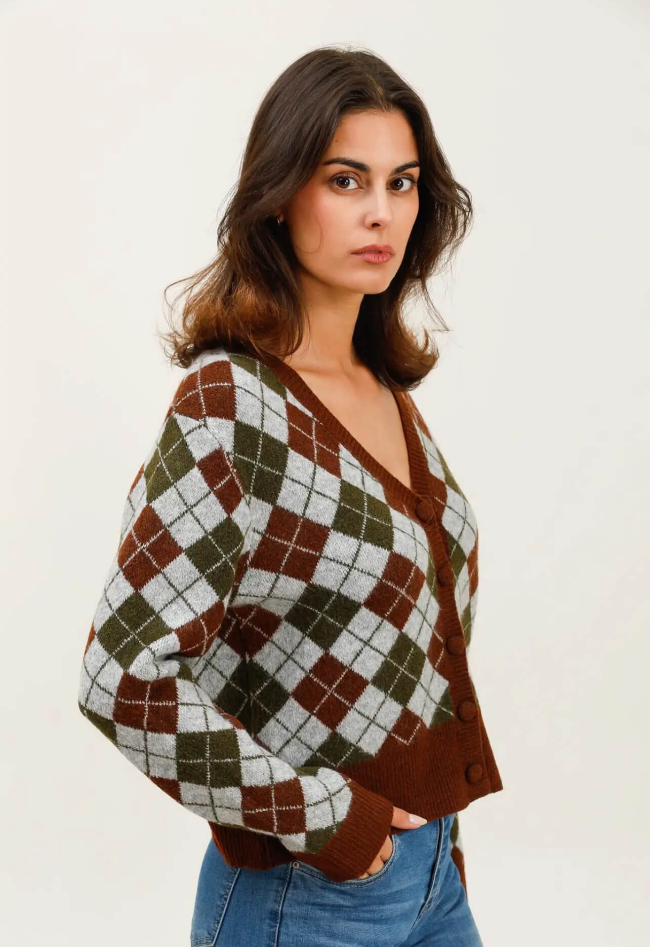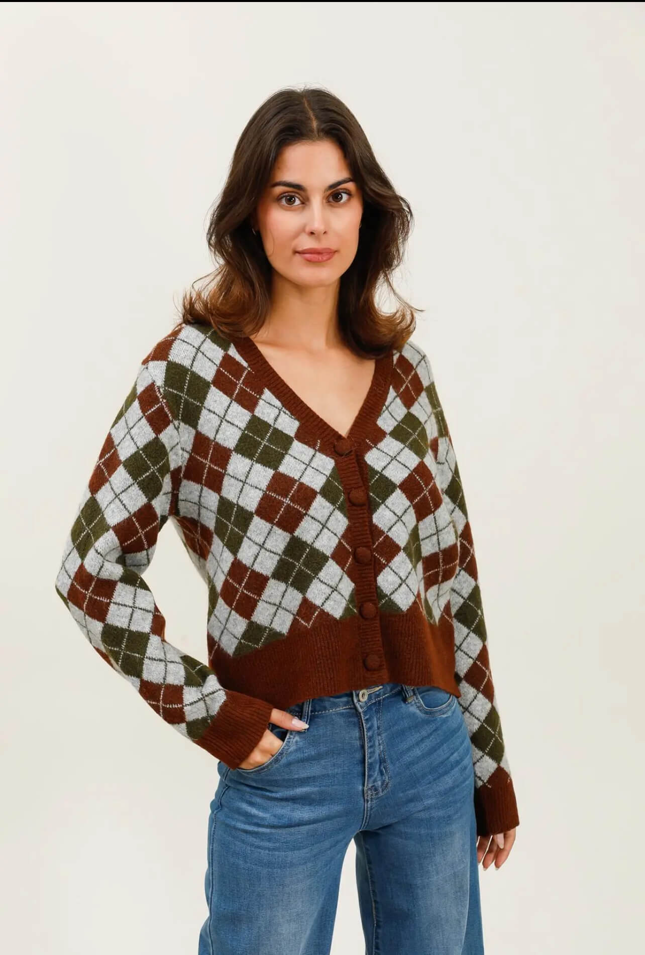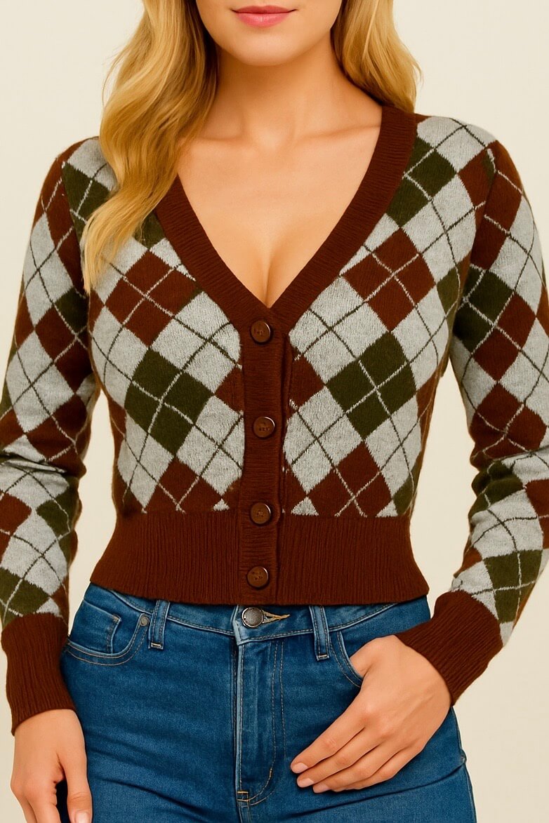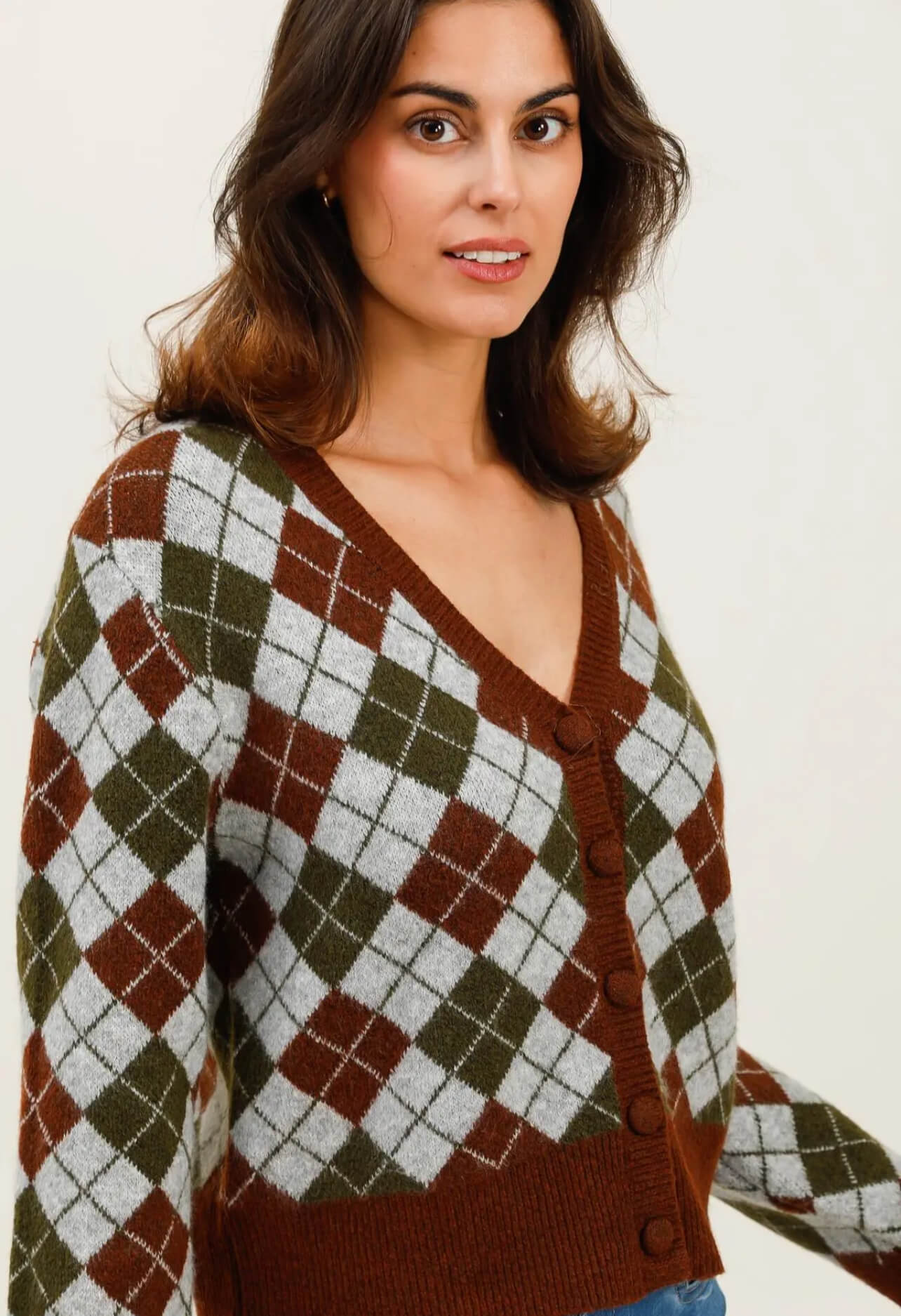 Un cardigan à losanges marron, vert olive et gris perle, avec ses boutons ton sur ton, son décolleté en V flatteur et son allure de campus chic.