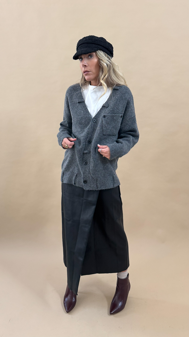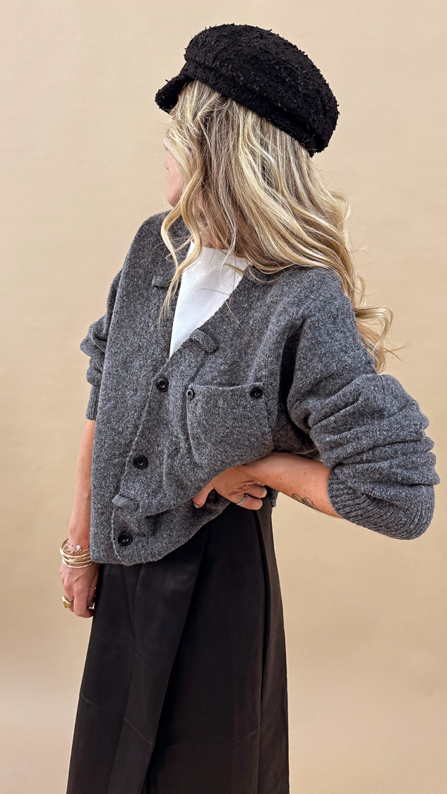 Le cardigan gris ultra doux avec ses boutons noirs et ses passants pour mettre une ceinture ou un foulard, sera parfait pour un look cocooning .