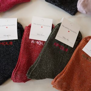 Adopte ta petite paire de chaussettes en lurex aux coloris beaucoup plus mignons les uns que les autres. Opte pour le message « amour », « bichette », « joli coeur » ou « chaton ».