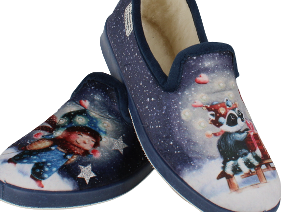 Prolongez la magie de la saison avec nos Pantoufles Féeriques de Noël, un mélange parfait de confort et de style festif. Chaque pas sera une danse hivernale avec un lutin et un malicieux raton laveur, tous deux vêtus de leurs tenues de fête. Le chausson gauche est décoré d’un bonhomme vêtu d’une salopette bleue assorti à son bonnet. Sur le chausson droit on peut voir un adorable raton laveur transportant un cadeau sur une luge. Tous deux sur fond nuit étoilée avec une délicate chute de neige. Ces chaussures type charentaises offrent un confort enveloppant. Le dessus en velours doux au toucher donne une sensation luxueuse, la doublure en laine est une promesse de pieds bien au chaud pendant les longues soirées d’hiver. La semelle en caoutchouc souple et antidérapant offre une adhérence sécurisée accentuée par le petit talon décroché.