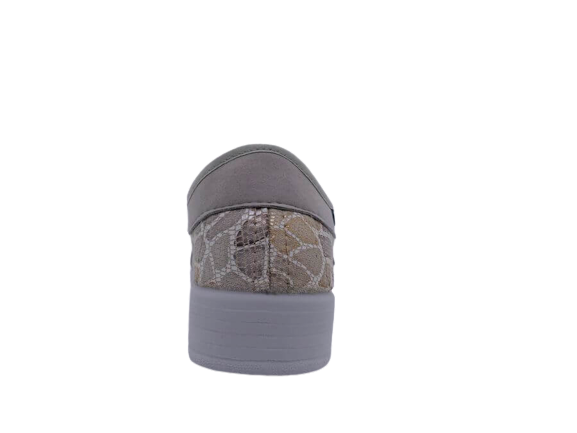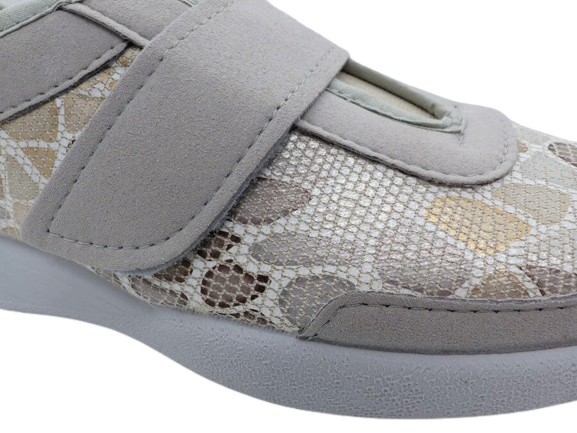 Chaussures femme à velcro talon compensé empiècement stretch coloris gris et beige multi
