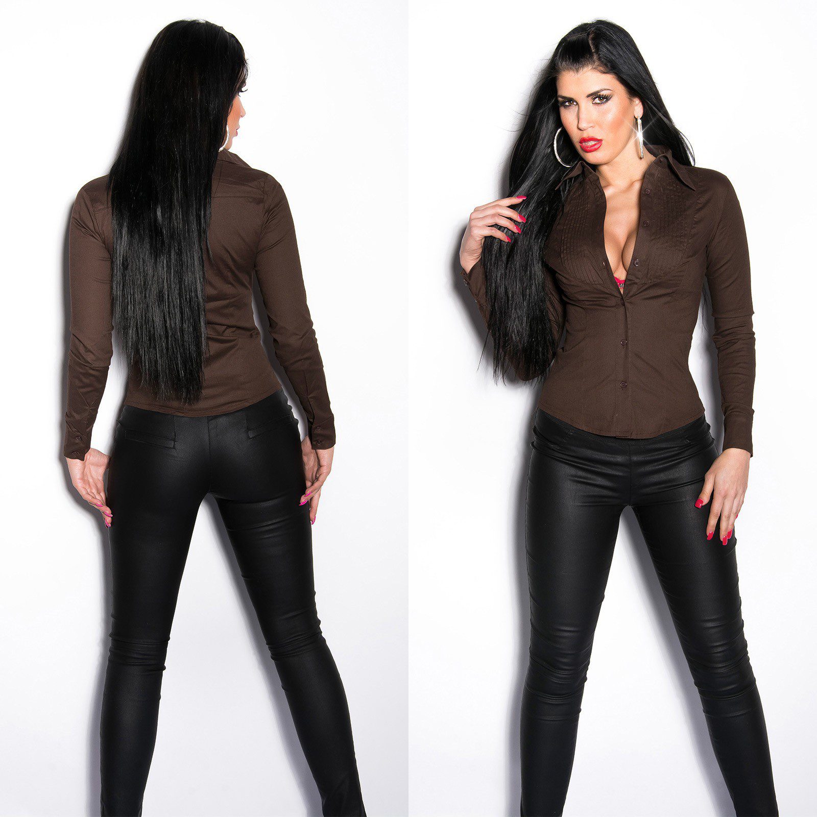 Chemise femme fashion sexy cintrée manches longues couleur marron