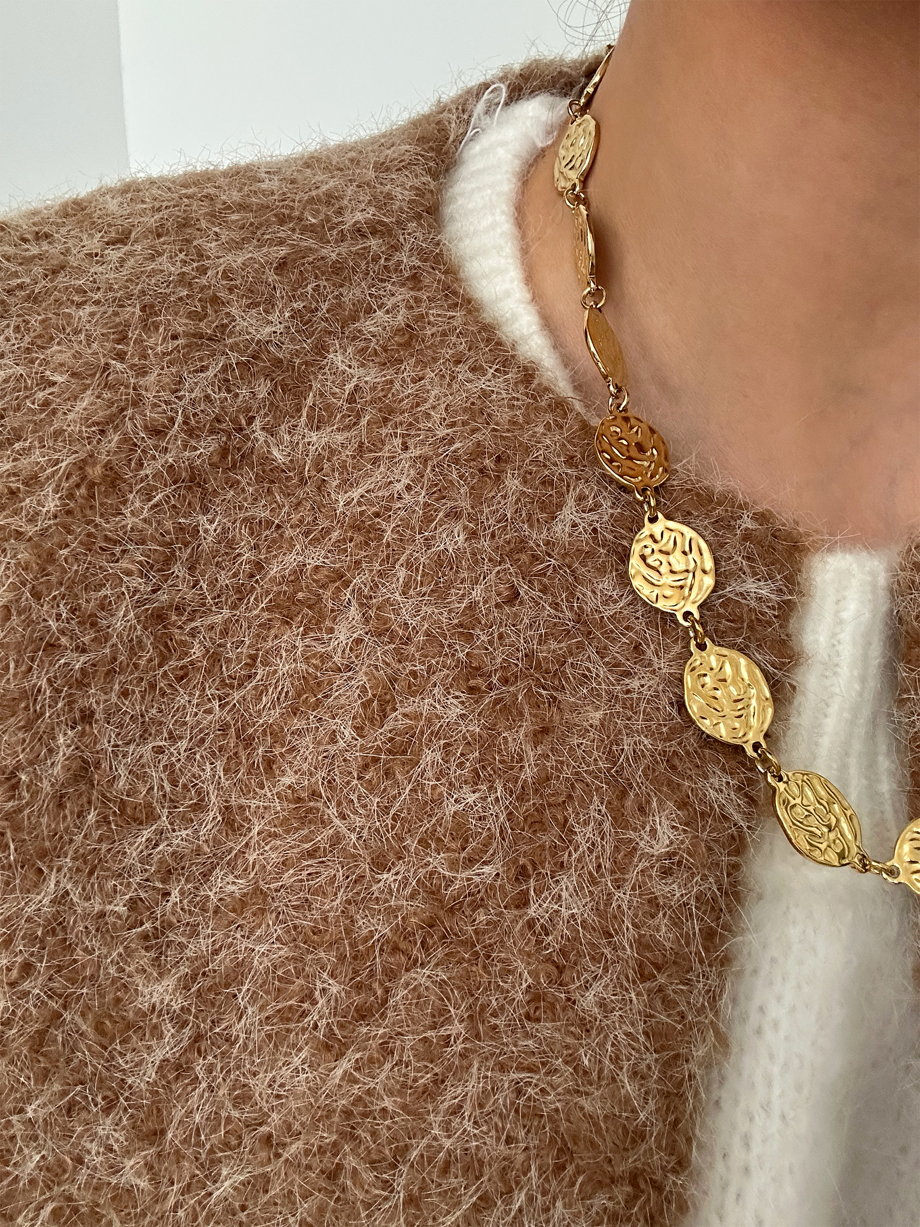 Le collier Kaellis est le bijou qui mixe élégance et caractère ! Avec ses maillons ronds finement ciselés en acier inoxydable doré, il attire la lumière et apporte une touche sophistiquée et originale à toutes vos tenues.