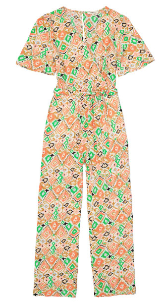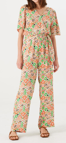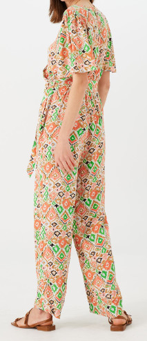 Combinaison fluide manches courtes. Imprimé graphique. Encolure cache coeur fermée par un bouton pression. Taille élastiquée, ceinture à passant.