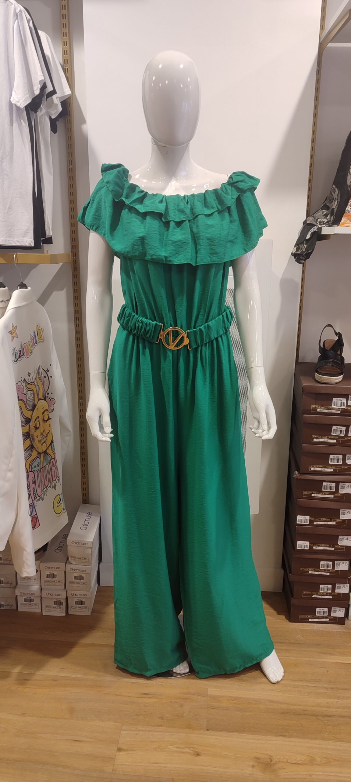 Combinaison pantalon col bateau froufrou vert