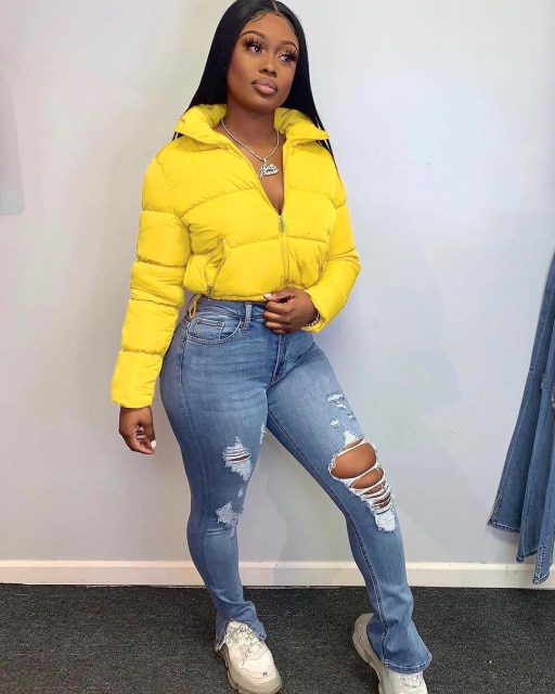 Au fil des derniers mois, nous nous sommes rendu compte que certaines d’entre vous adorent le jaune. Par conséquent, voici notre doudoune jaune femme que vous devriez beaucoup aimer pour son style qui sort de l’ordinaire. En fait, cette dernière, en coton, élasthanne et polyester, s’arrête au niveau du nombril approximativement si vous resserrez le bas avec les élastiques, ce qui signifie que si vous ne souhaitez pas avoir le bas du ventre à l’air en plein hiver, vous devrez la porter avec un bas taille haute comme un legging, un jeans ou pourquoi pas avec une jupe et un collant d’hiver. Si vous n’attachez pas l’élastique en bas, la doudoune devrait arriver juste au niveau de votre taille.
