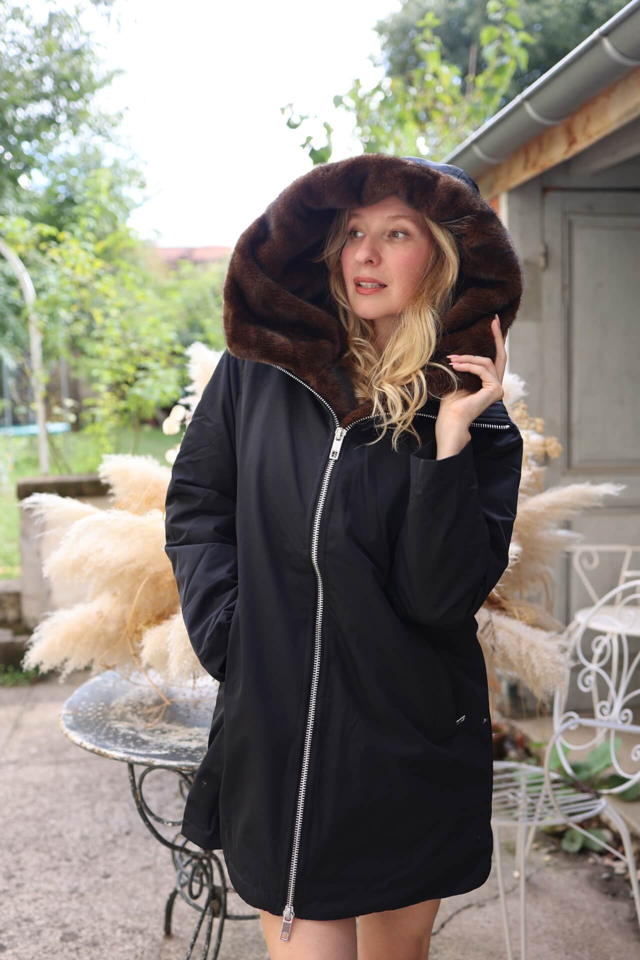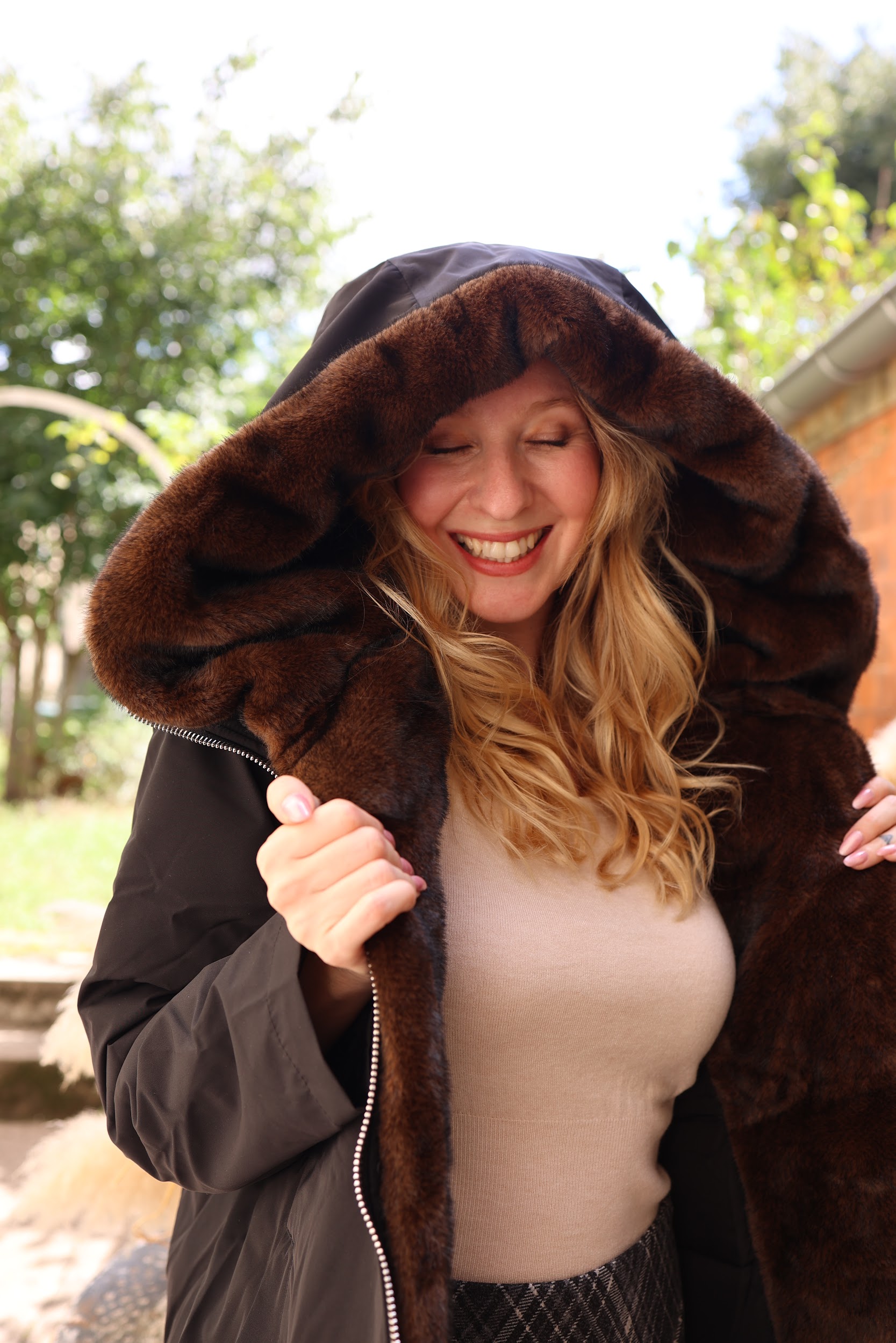 Capuche oversize bordée de fausse fourrure ultra-douce (amovible si tu veux la jouer plus minimaliste), matière déperlante pour braver la pluie, doublure chaude pour affronter les journées glacées sans jamais sacrifier ton style.