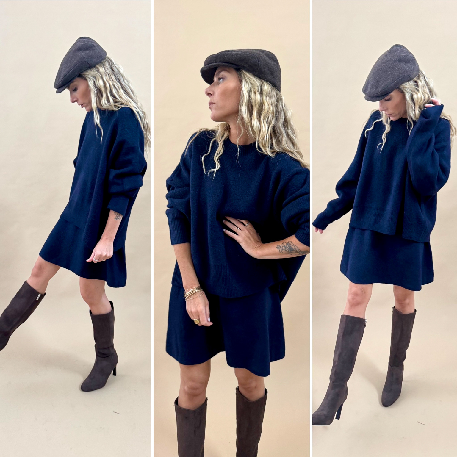 Chic et confortable, cet ensemble en maille bleu marine associe un pull doux et une jupe assortie pour une silhouette élégante et harmonieuse. Sa texture légèrement laineuse apporte chaleur et raffinement, idéale pour la mi – saison et l’hiver !