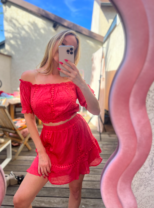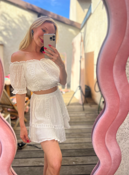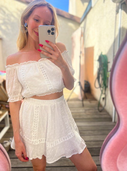 Le petit ensemble si sexy et ingénu en même temps ! Il cartonnera sur vous avec votre peau hâlée et votre salty hair naturel. La jupe est le top sont confortablement élastiqués. Les épaules du top sont bardot et la jupe assez longue pour vous permettre de dévoiler vos gambettes sans que cela soit trop court ! Un coup de coeur absolu.