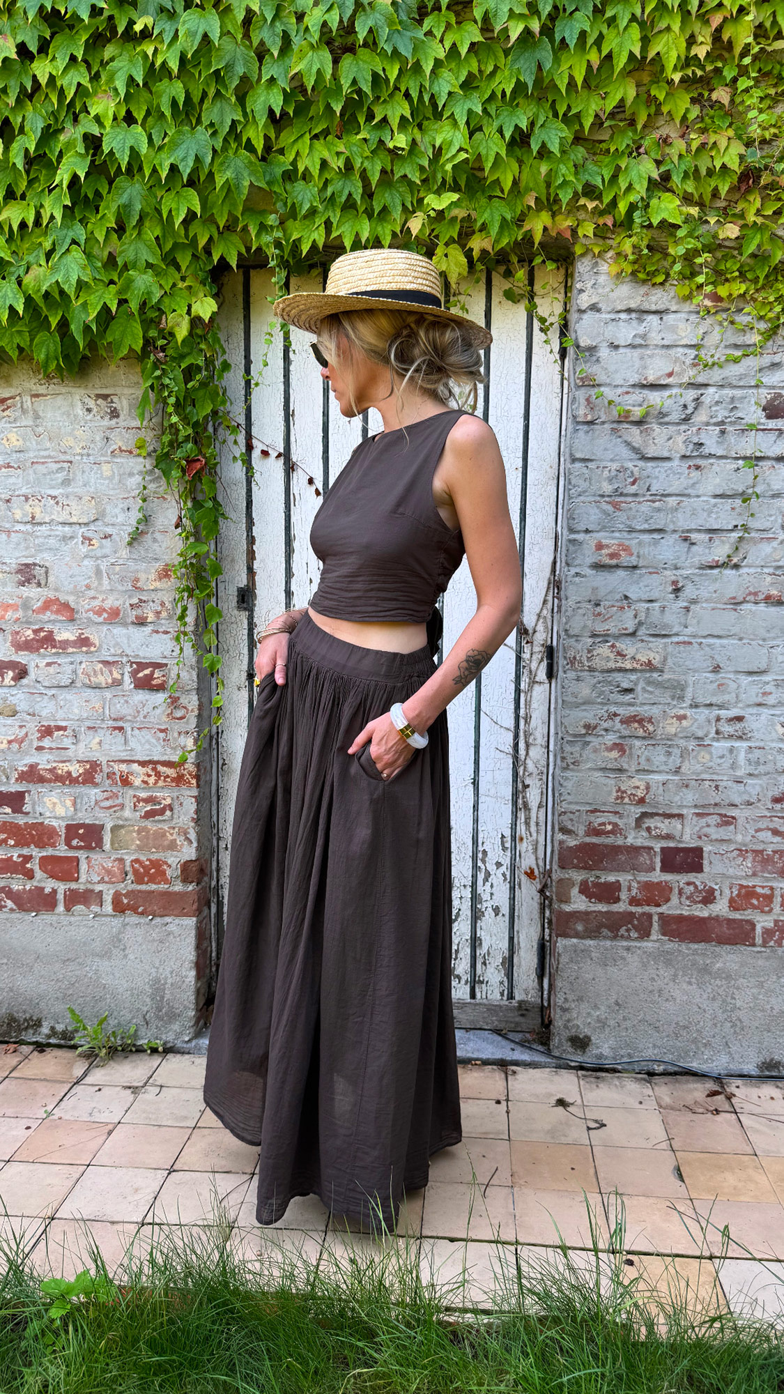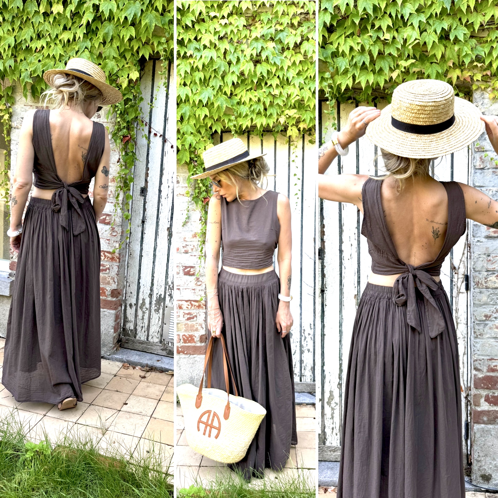 Sublimez vos journées avec cet ensemble marron tout en douceur. La jupe fluide à taille élastique s’accorde parfaitement au haut dos nu, délicatement noué, pour une silhouette féminine et légère. L’alliance parfaite entre confort et élégance pour vos moments de charme.
