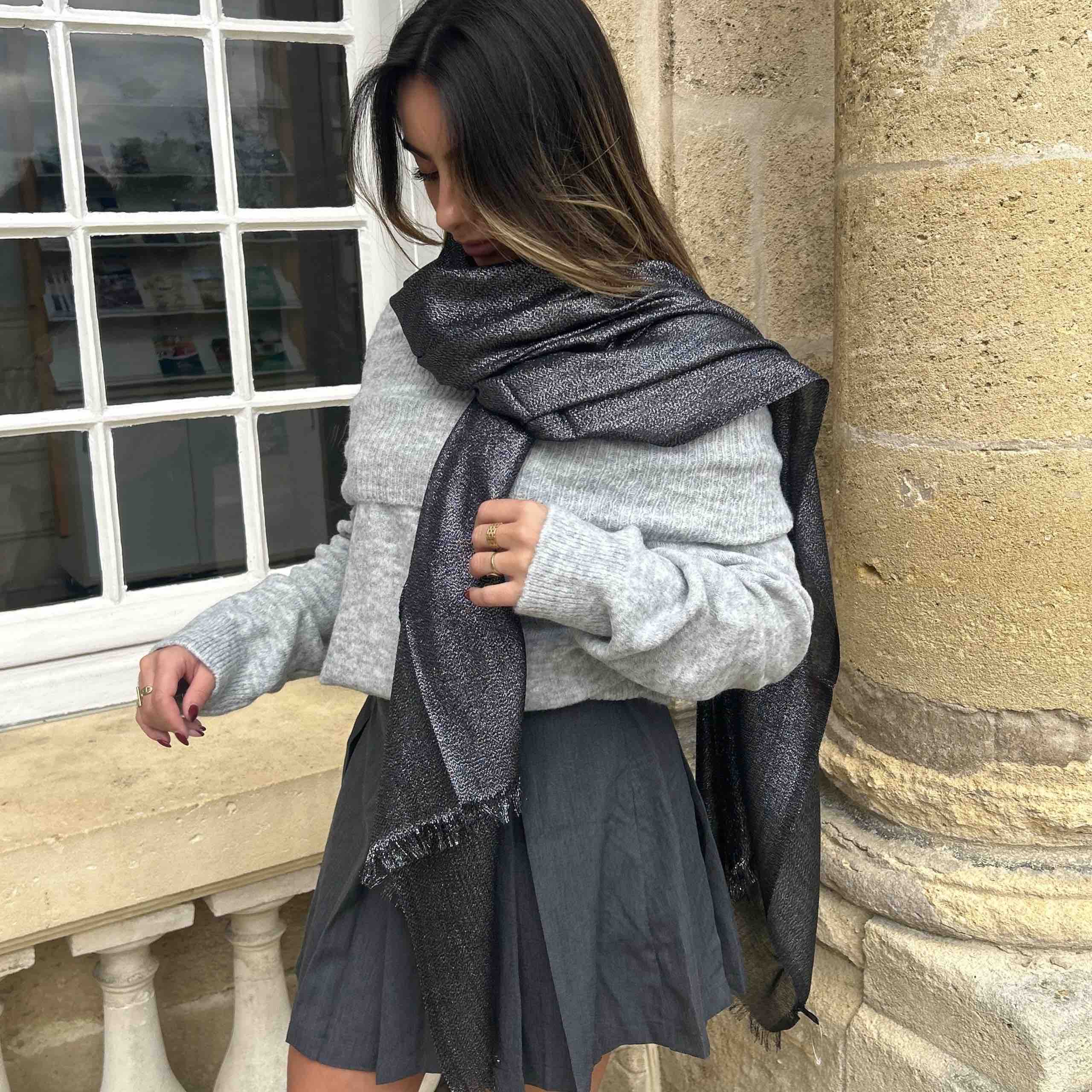 Ce foulard à paillettes apporte une touche d’éclat discret et sophistiqué, parfait pour rehausser une tenue avec élégance. Son design chic en fait un accessoire idéal pour les occasions spéciales.
