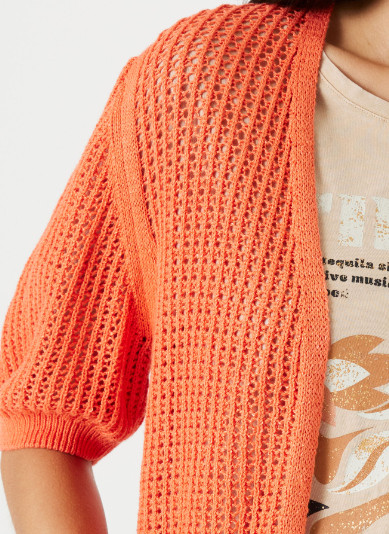 Gilet manches courtes ouvert en maille, aspect légèrement brillant.
