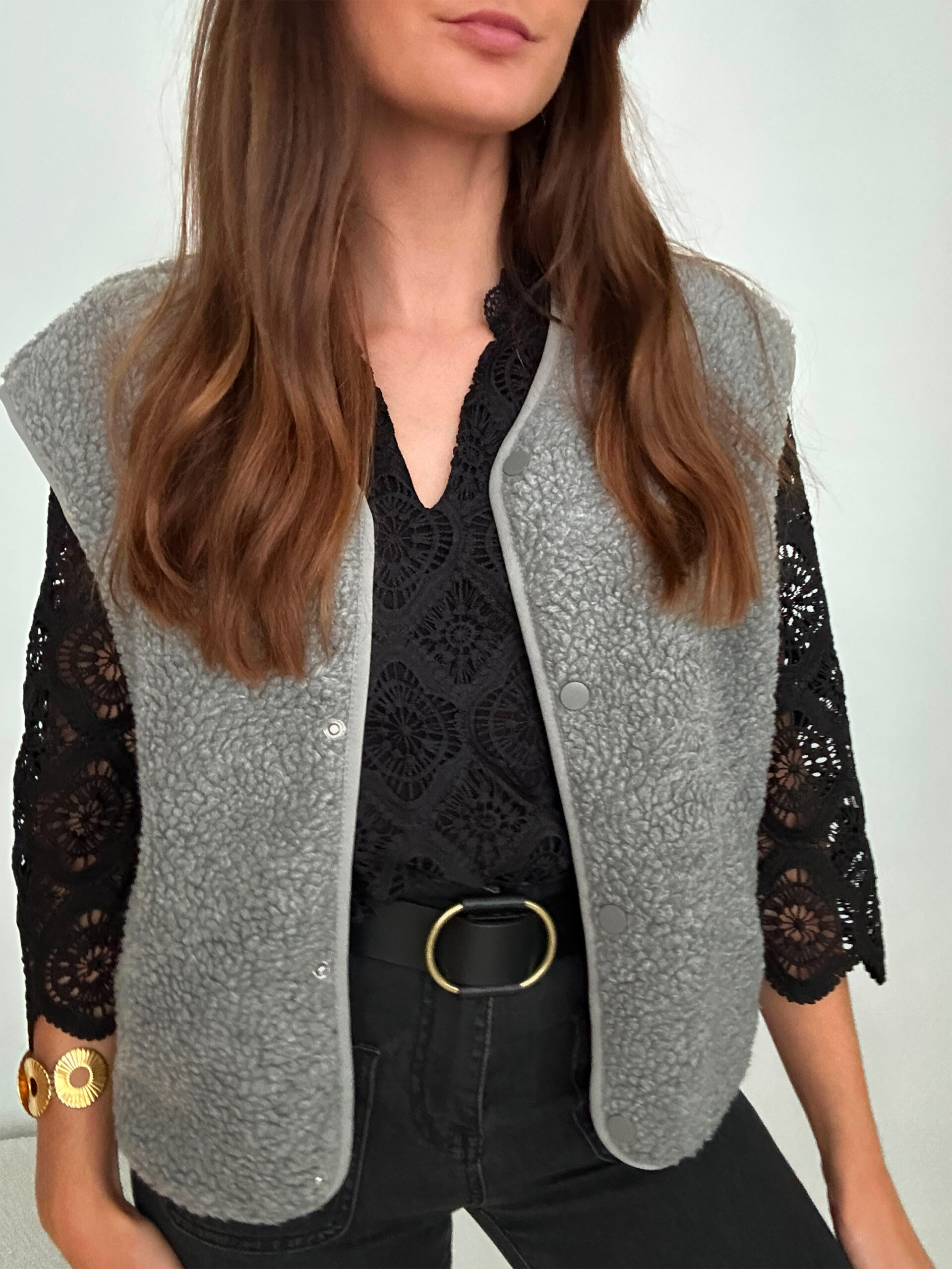 Affrontez l’hiver avec élégance et chaleur grâce à notre gilet gris MILA sans manches ! Une pièce incontournable pour un style chic et confortable par temps froid.
