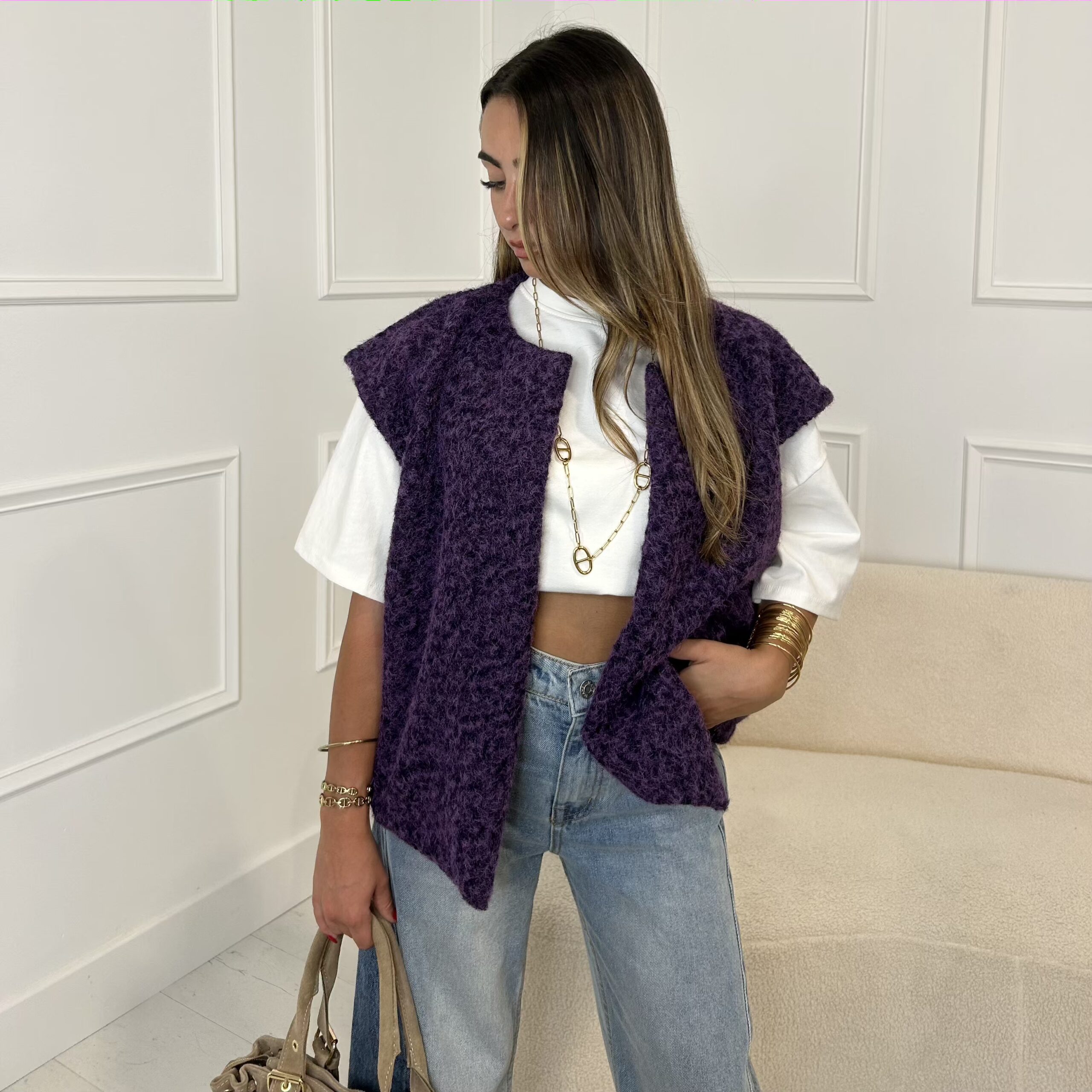 Ce gilet sans manches doux et texturé, est super simple et stylé. Avec sa coupe droite, il se porte facilement sur un joli haut pour un look chill et tendance.