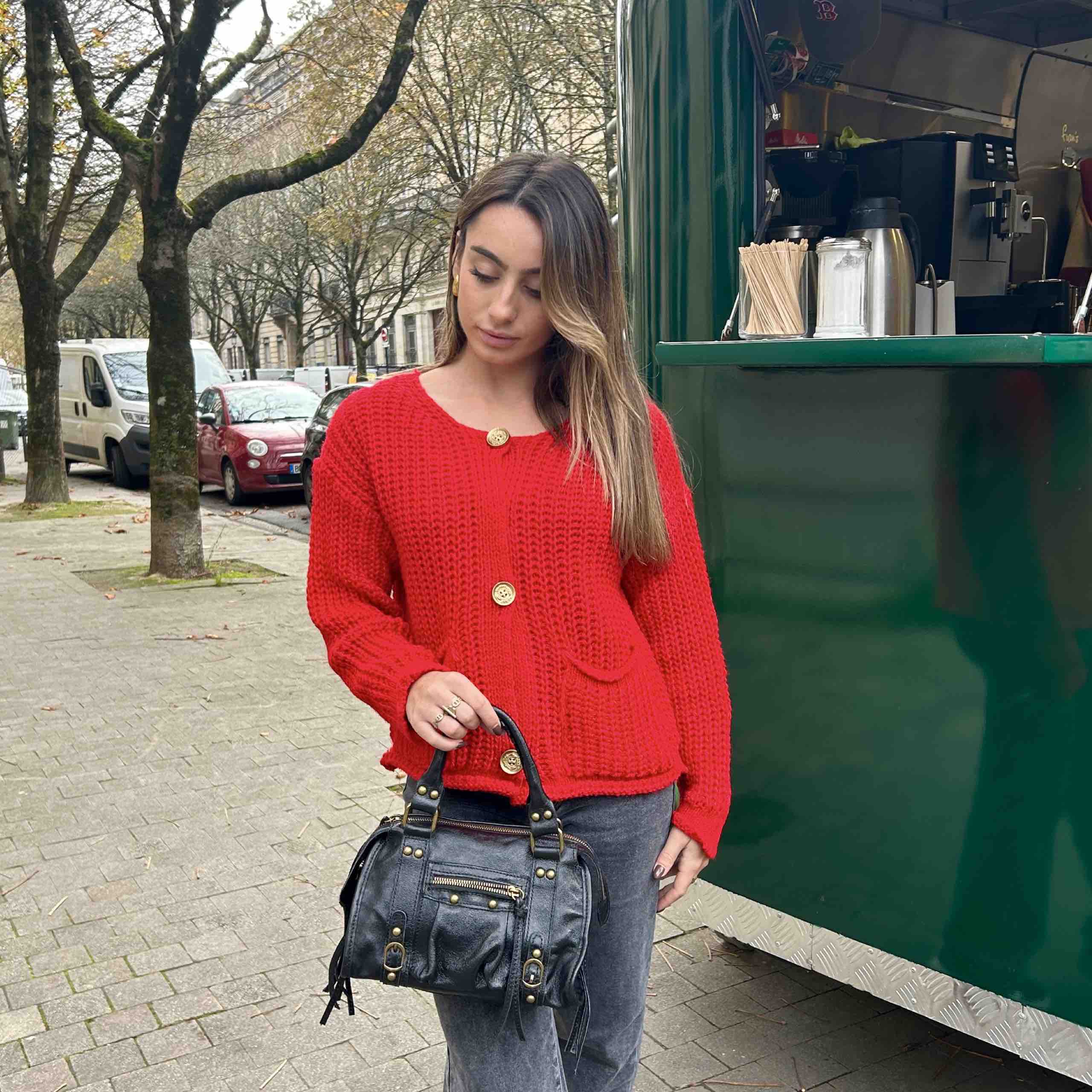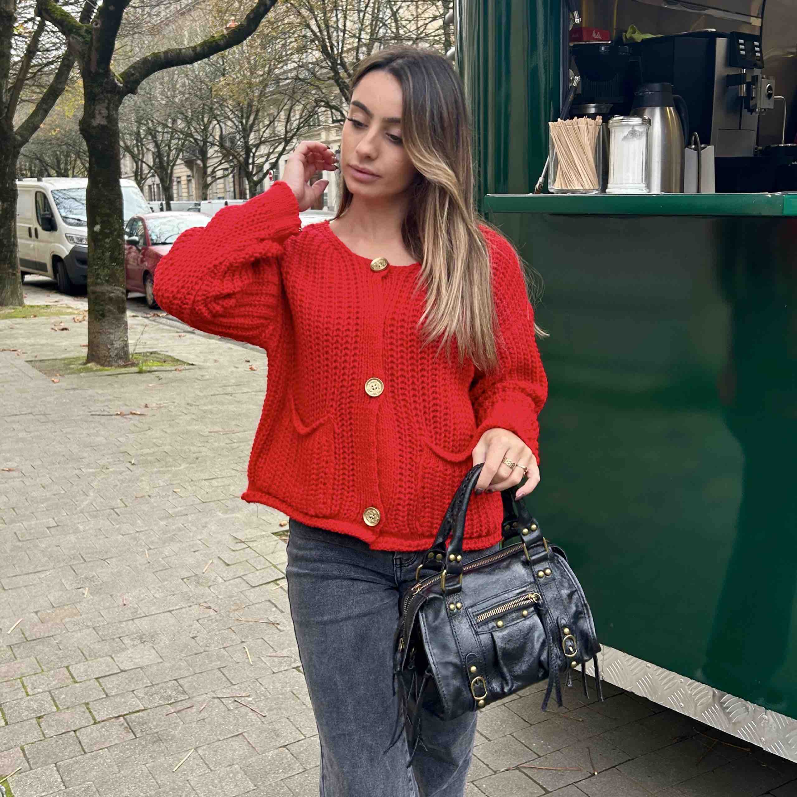 Ce gilet en maille, à la fois doux et structuré, est orné de boutons dorés qui ajoutent une touche d’élégance raffinée. Parfait pour rehausser une tenue simple, il allie confort et style avec son design intemporel et ses finitions délicates.