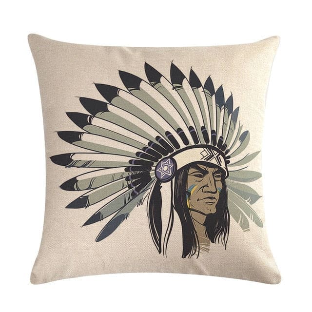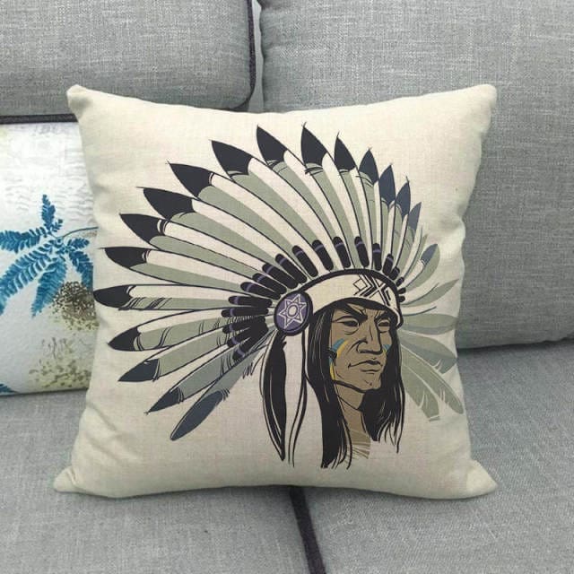Une Housse de Coussin Décoré d’une Tête de Chef Native Américain en Teintes Monochromes pour un Style Far West dans l’Espace de Sommeil de Votre Jeune Explorateur
