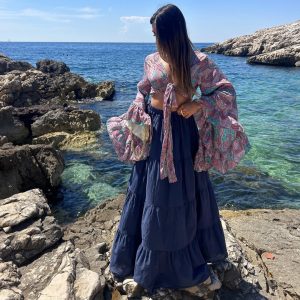 Cette jupe longue satinée combine élégance et féminité avec sa texture fluide et brillante. Rehaussée de détails en dentelle délicate, elle crée un équilibre parfait entre raffinement et sensualité pour un look chic et sophistiqué.