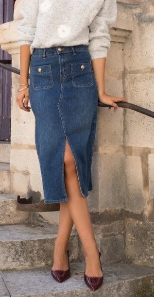 Jupe stretch en jean mi-longue. Fendue à l’avant. Deux poches avant et arrière. 85% coton 13% polyester 2% élasthanne Lavage machine 30°