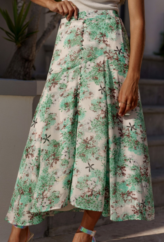 Magnifique jupe longue entièrement doublée. Fendue sur le côté avec petits boutons fantaisies. Coupe légèrement asymétrique. Taille élastiquée à l’arrière.