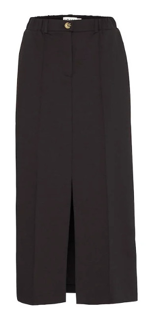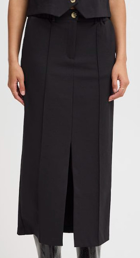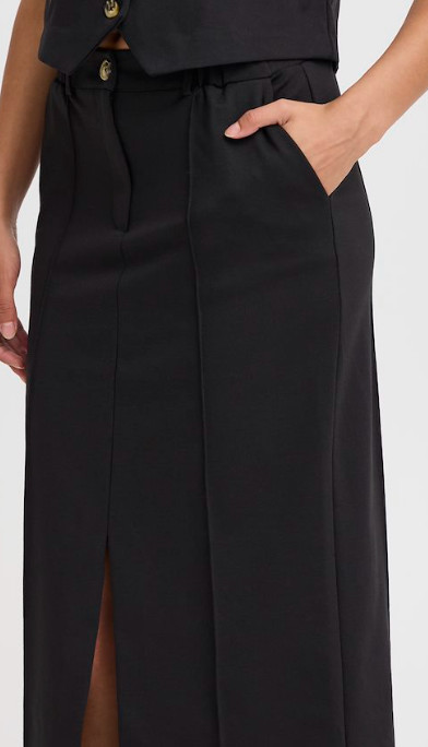 Jupe longue fendue. Deux poches sur le côté. Taille élastique à l’arrière et fermeture avec bouton et zip.