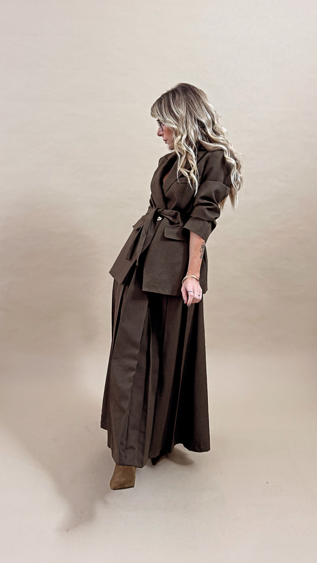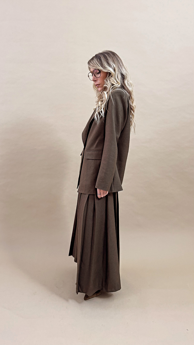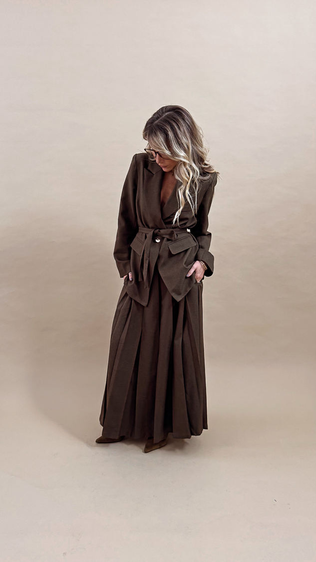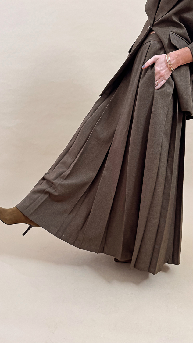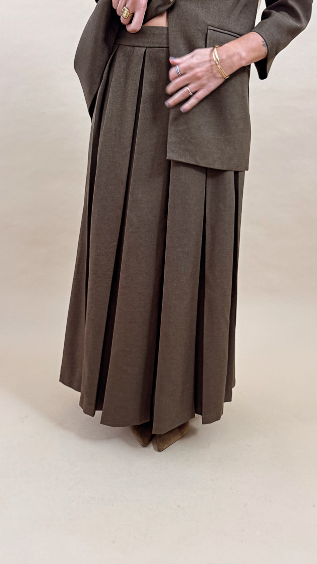 La jupe longue marron kaki plissée pour un style chic et élégant, ira parfaitement avec la veste blazer assortie et nos bottines suédine marron pour la saison automnale !