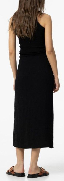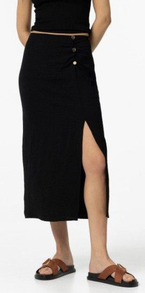 Jupe longue, fermeture zippée sur le côté. Fente avant et boutons décoratifs.